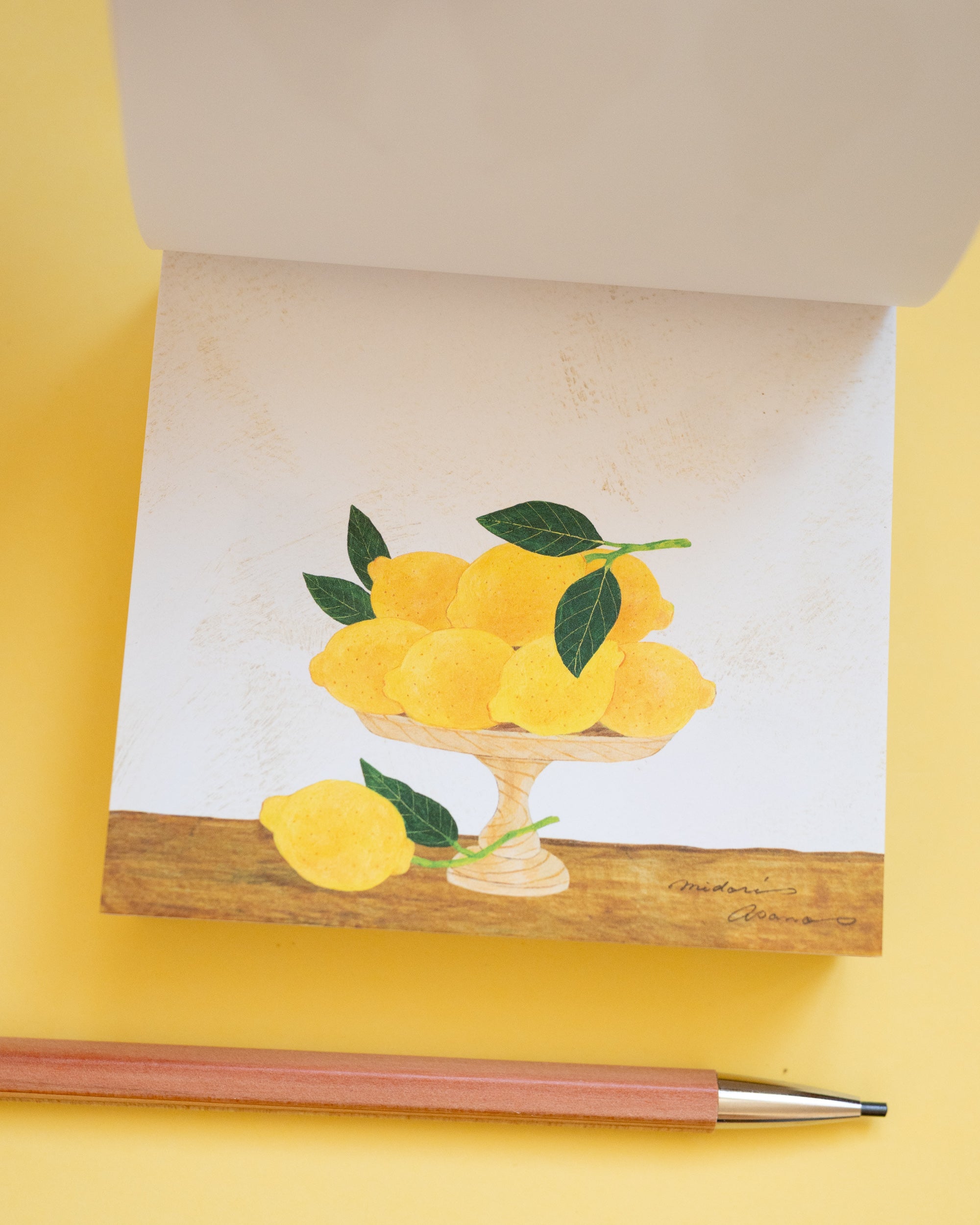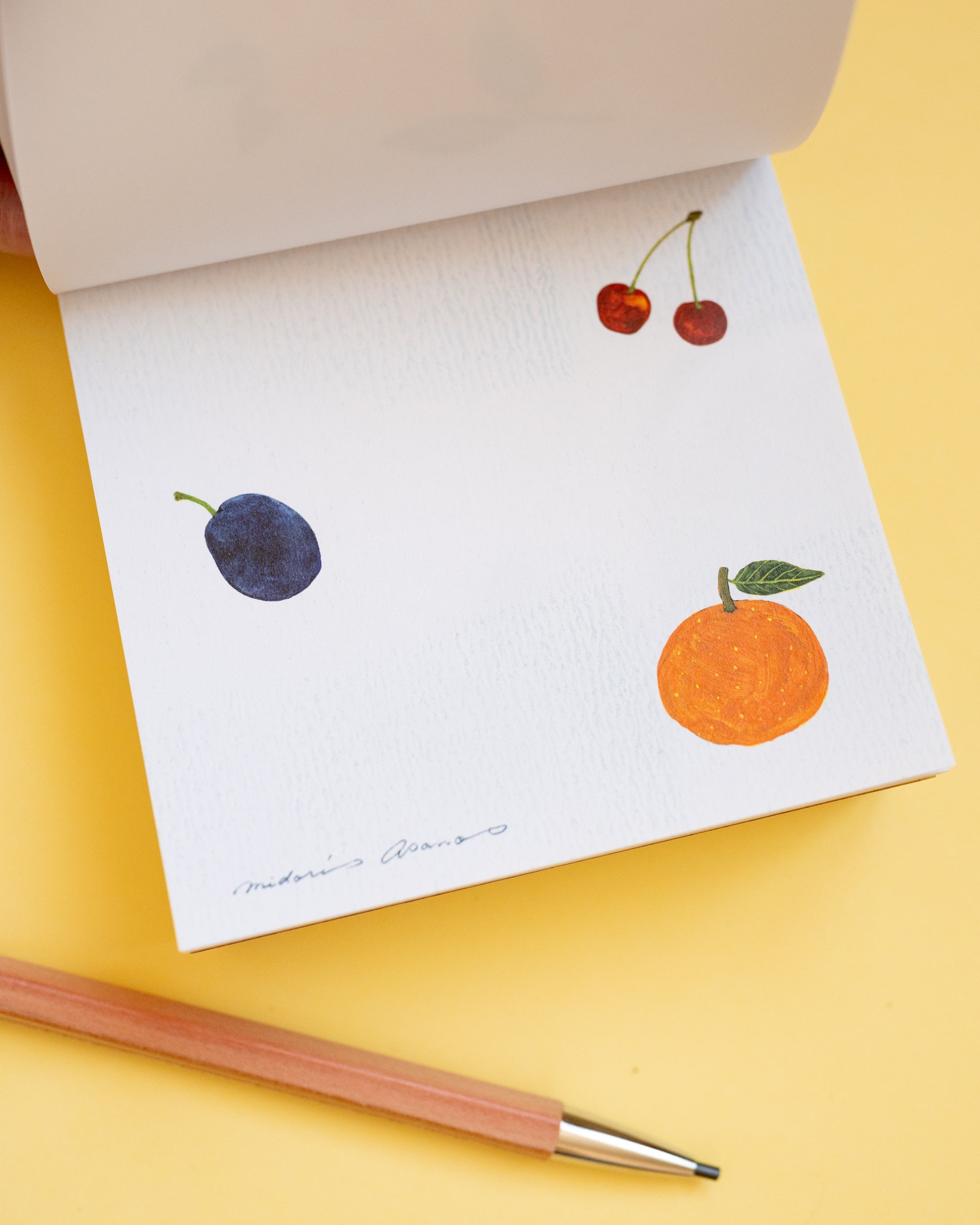 Craquez pour ce bloc-notes illustré par Midori Asano, mettant en scène des fruits. Avec son papier épais et résistant, ce bloc-notes est parfait pour vos notes quotidiennes, pour être utilisé comme carte accompagnant un cadeau ou pour décorer vos journaux créatifs.