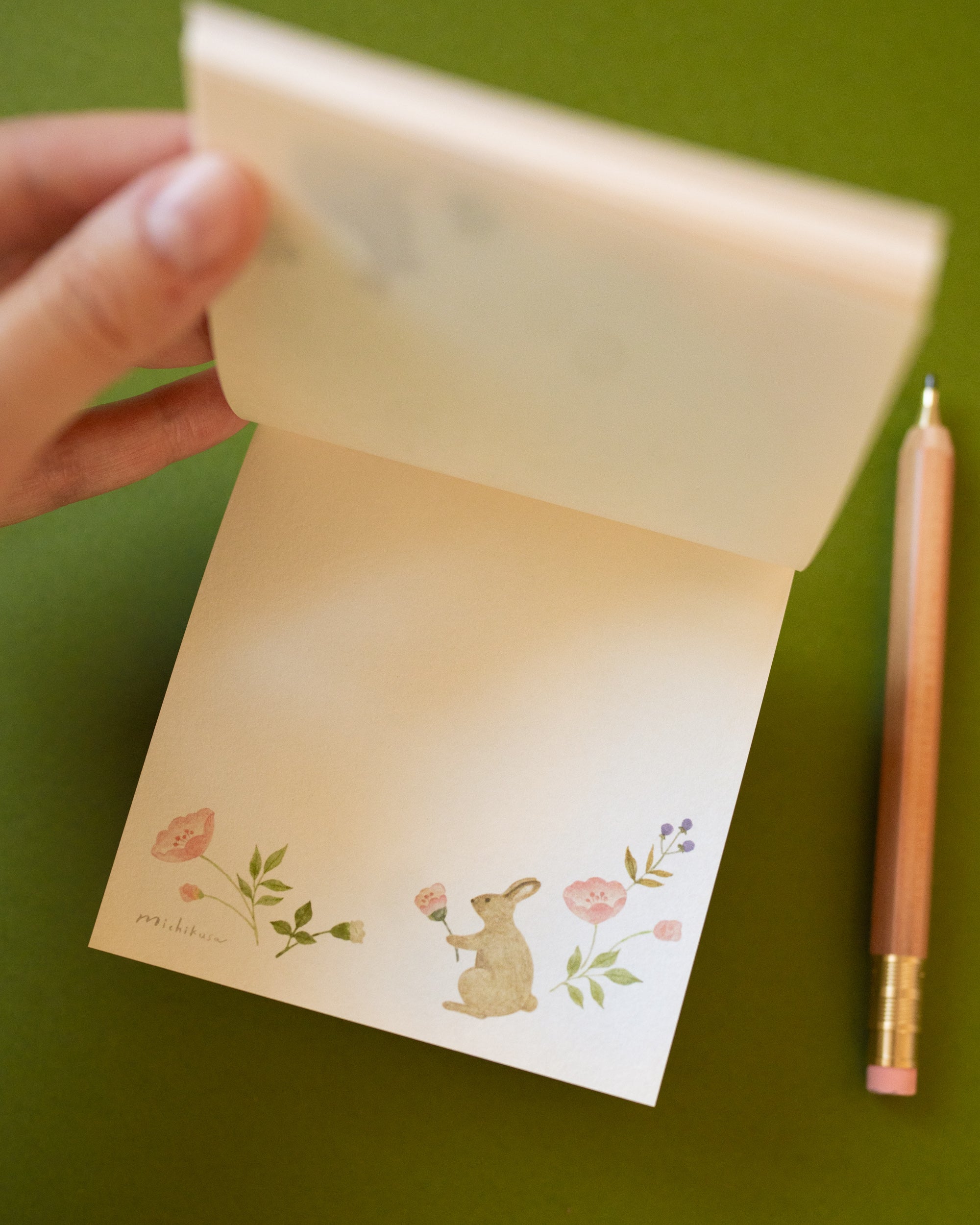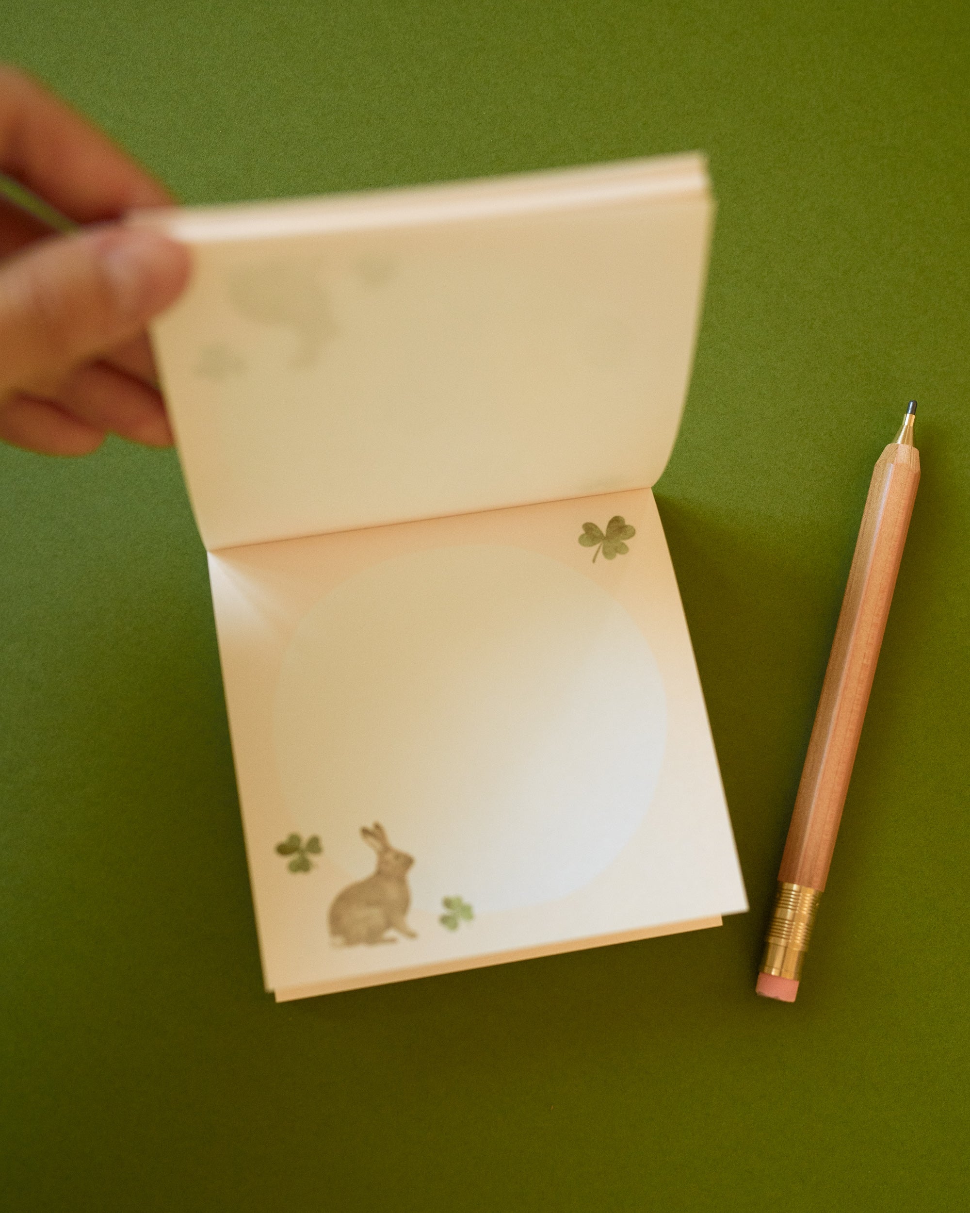 Apportez une touche de poésie à vos écrits avec ce bloc-notes enchanteur en papier washi illiustré de lapins, de trèfles et de fleurs. Parfait pour vos notes quotidiennes, pour laisser un message attentionné ou pour accompagner un cadeau.