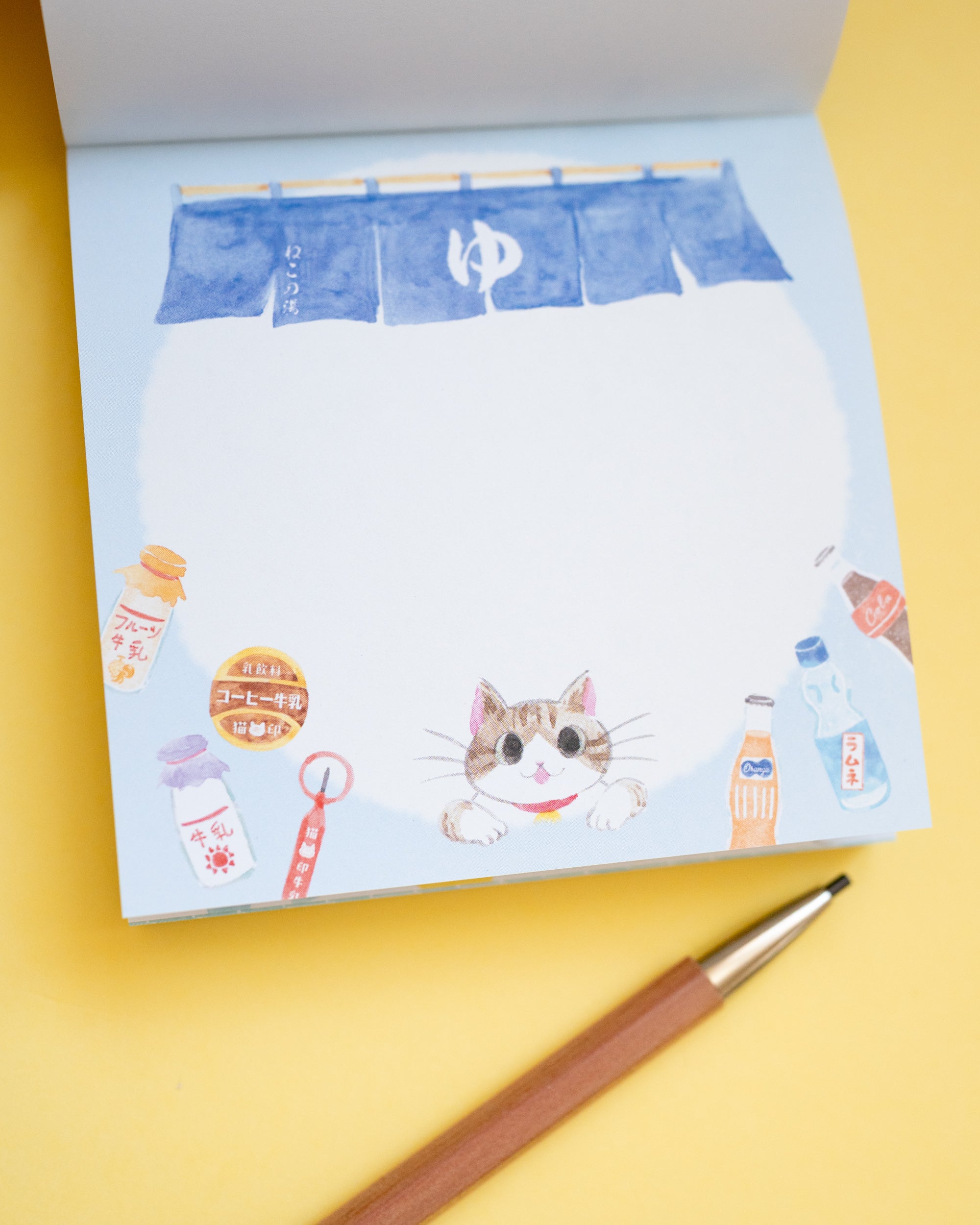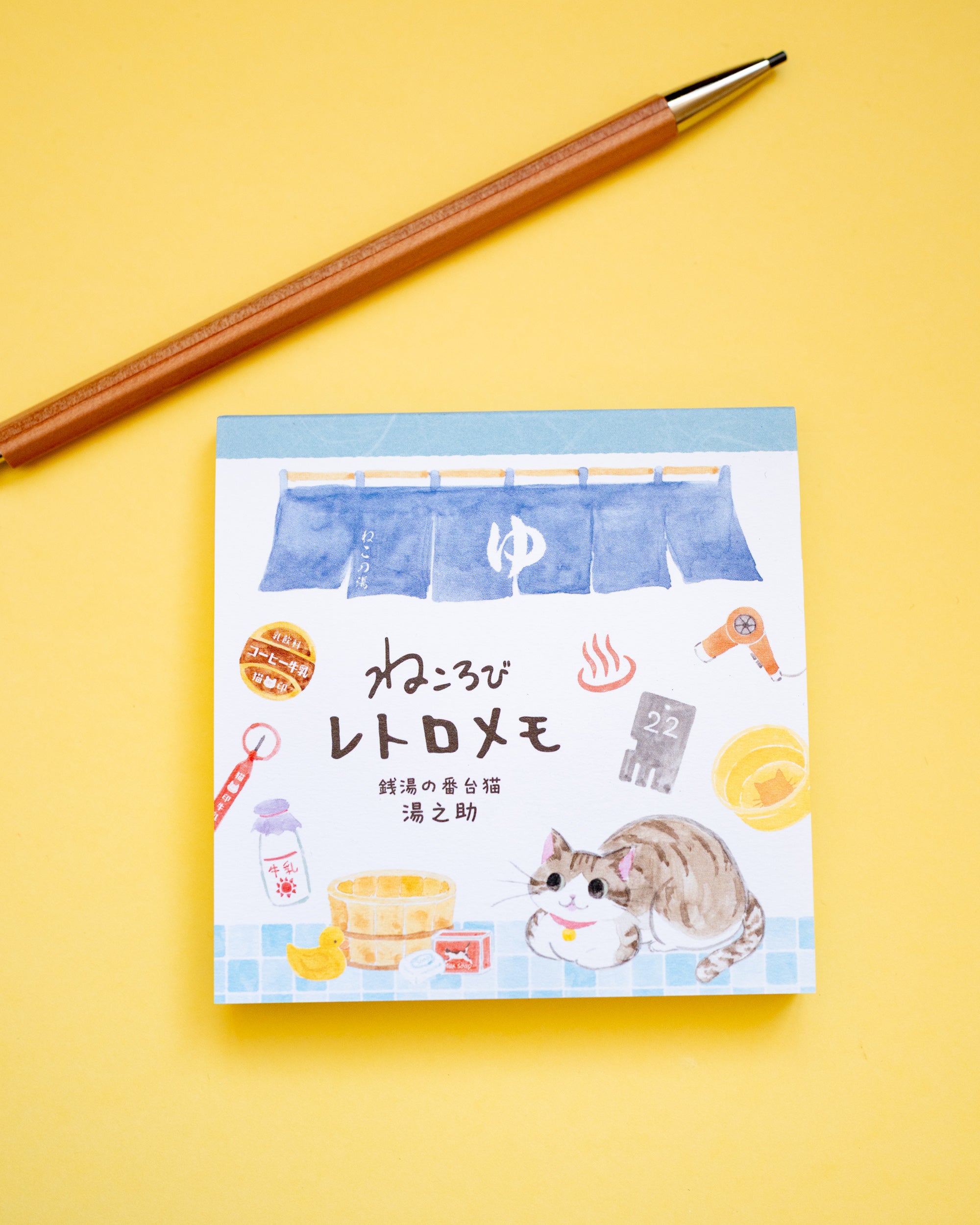 Plongez dans l’ambiance rétro d’un bain public japonais avec ce bloc-notes illustré mettant en vedette Yunosuke, le chat employé de ce sento. Autrefois chat errant, Yunosuke a fini par s’installer près de l’établissement et a conquis le cœur des habitués, devenant la mascotte officielle… même s’il n’aime pas les bains, d’après le personnel !