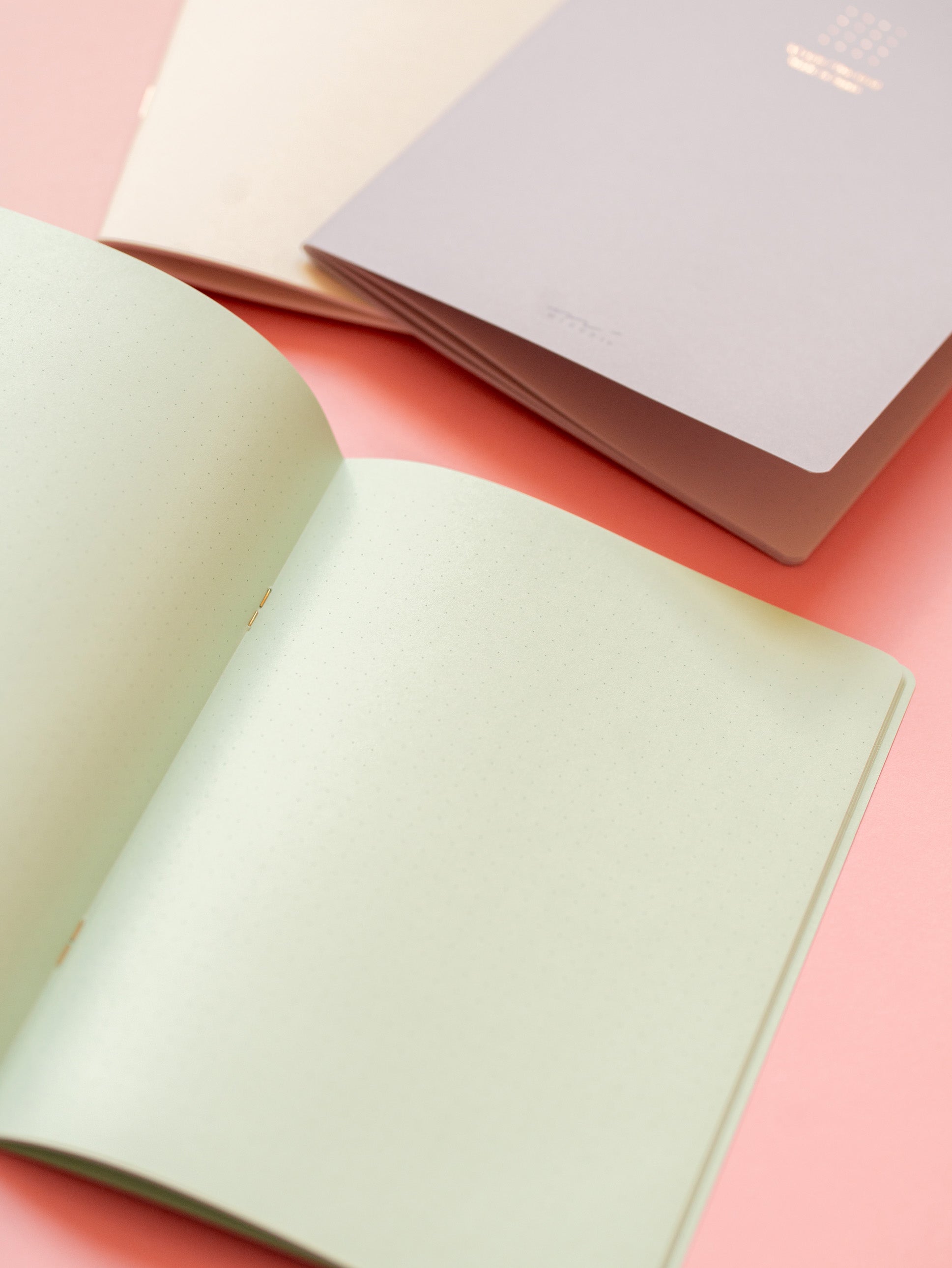 Avec ses pages pointillées assorties à la teinte vert pastel de la couverture, ce cahier format A5 de la marque Midori est idéal pour vos notes ou projets créatifs. Il contient 56 pages colorées et dispose d’une couverture souple et d’une reliure point sellier pour une finition soignée.