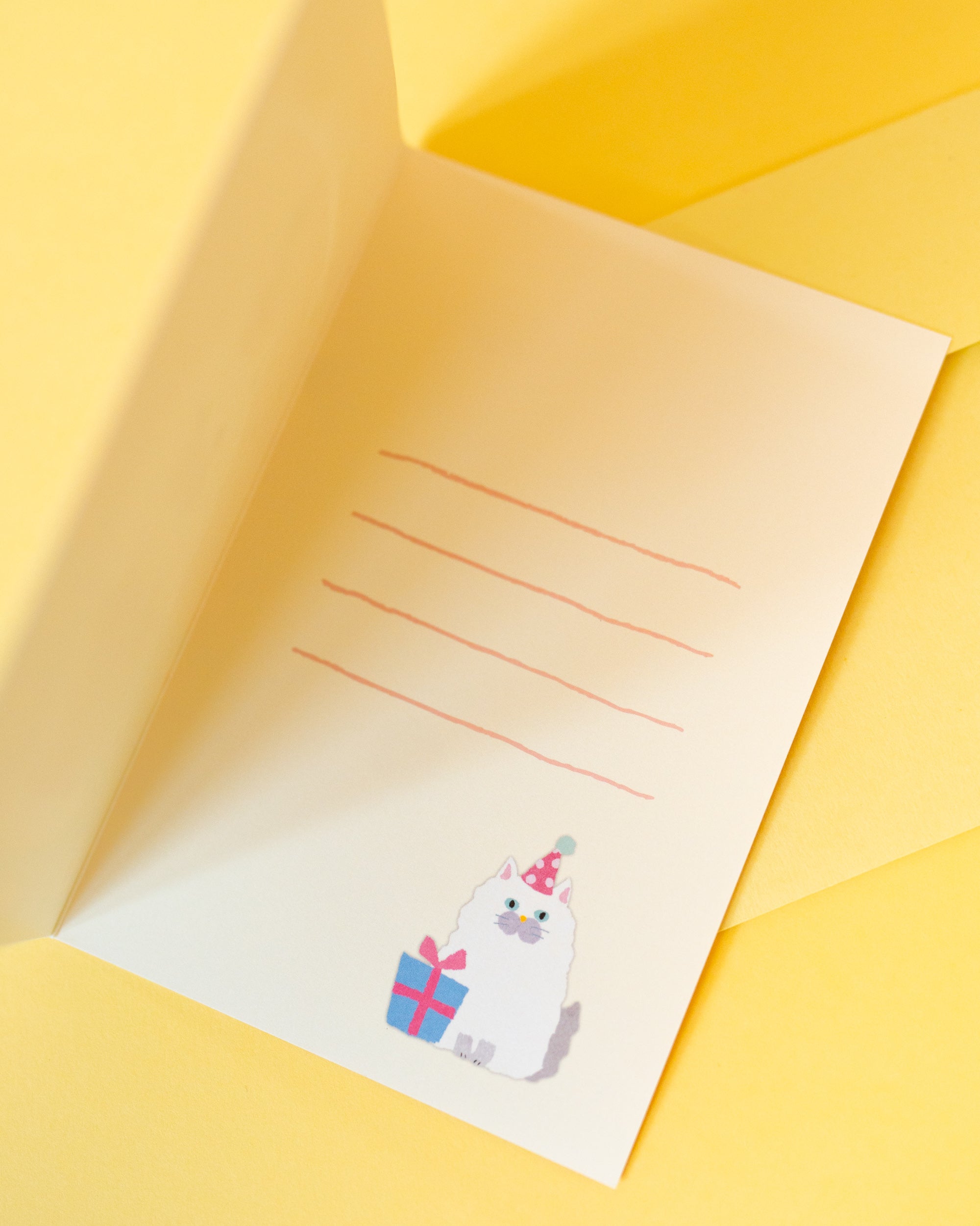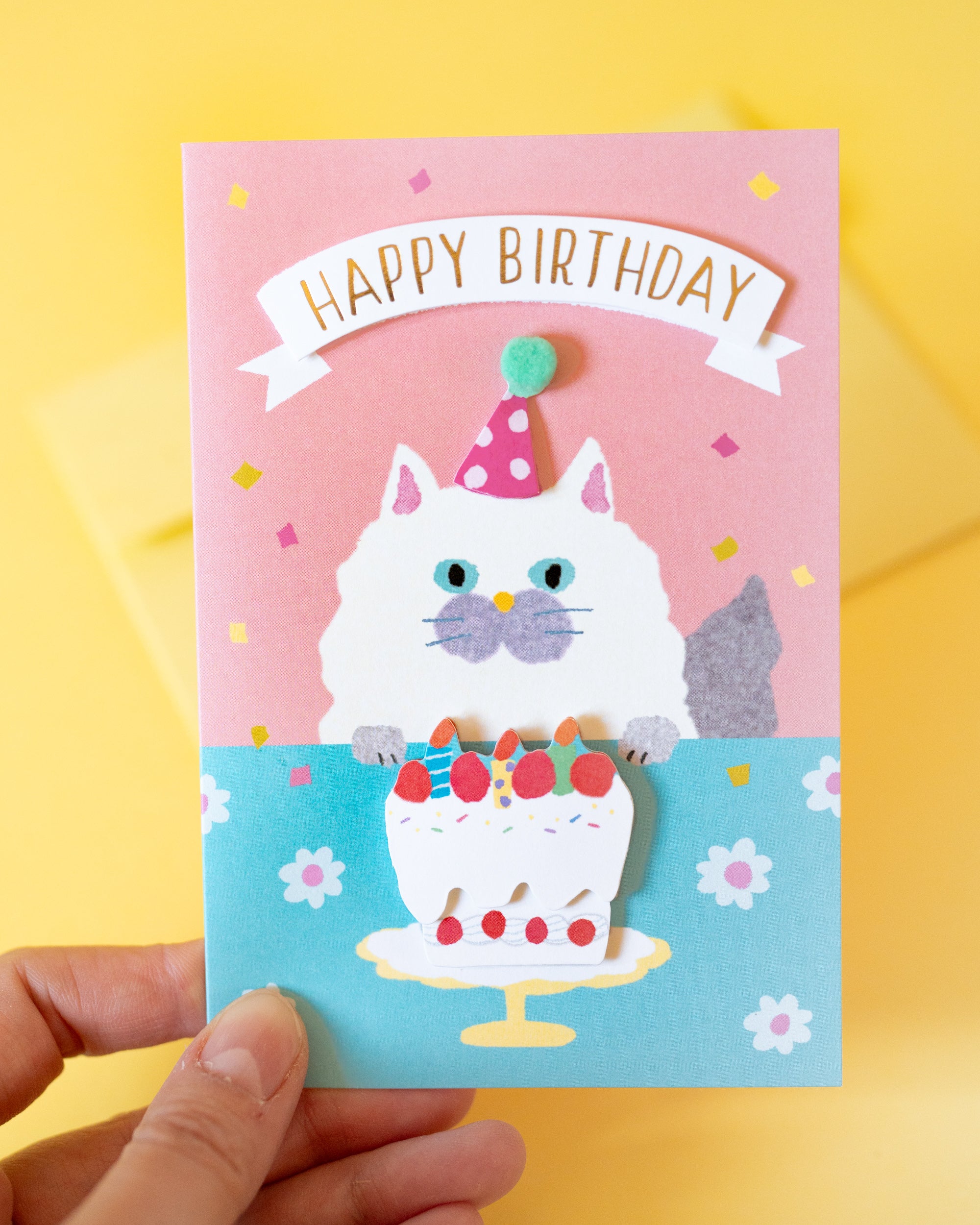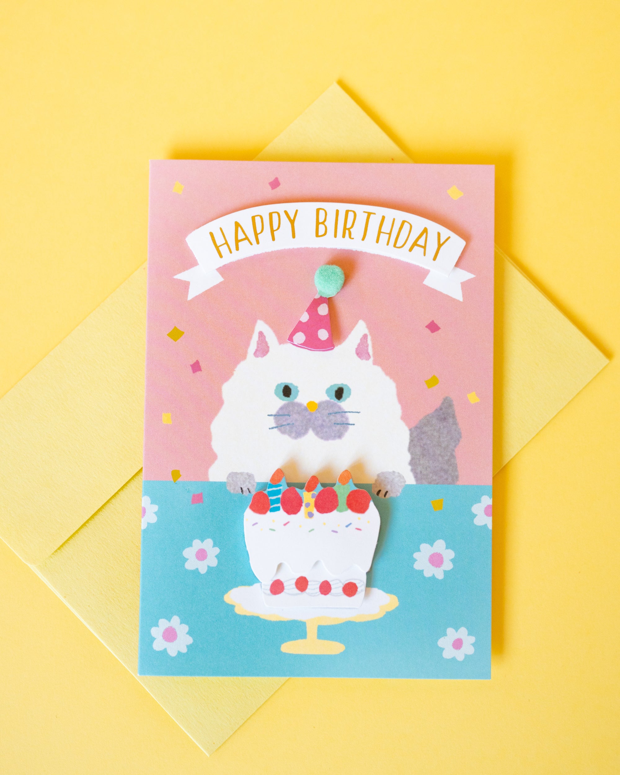 Laissez-vous charmer par cette carte faite à la main aux couleurs pop illustrant un chat célébrant son anniversaire avec un chapeau et un gâteau en 3D. Vendue avec une enveloppe assortie.