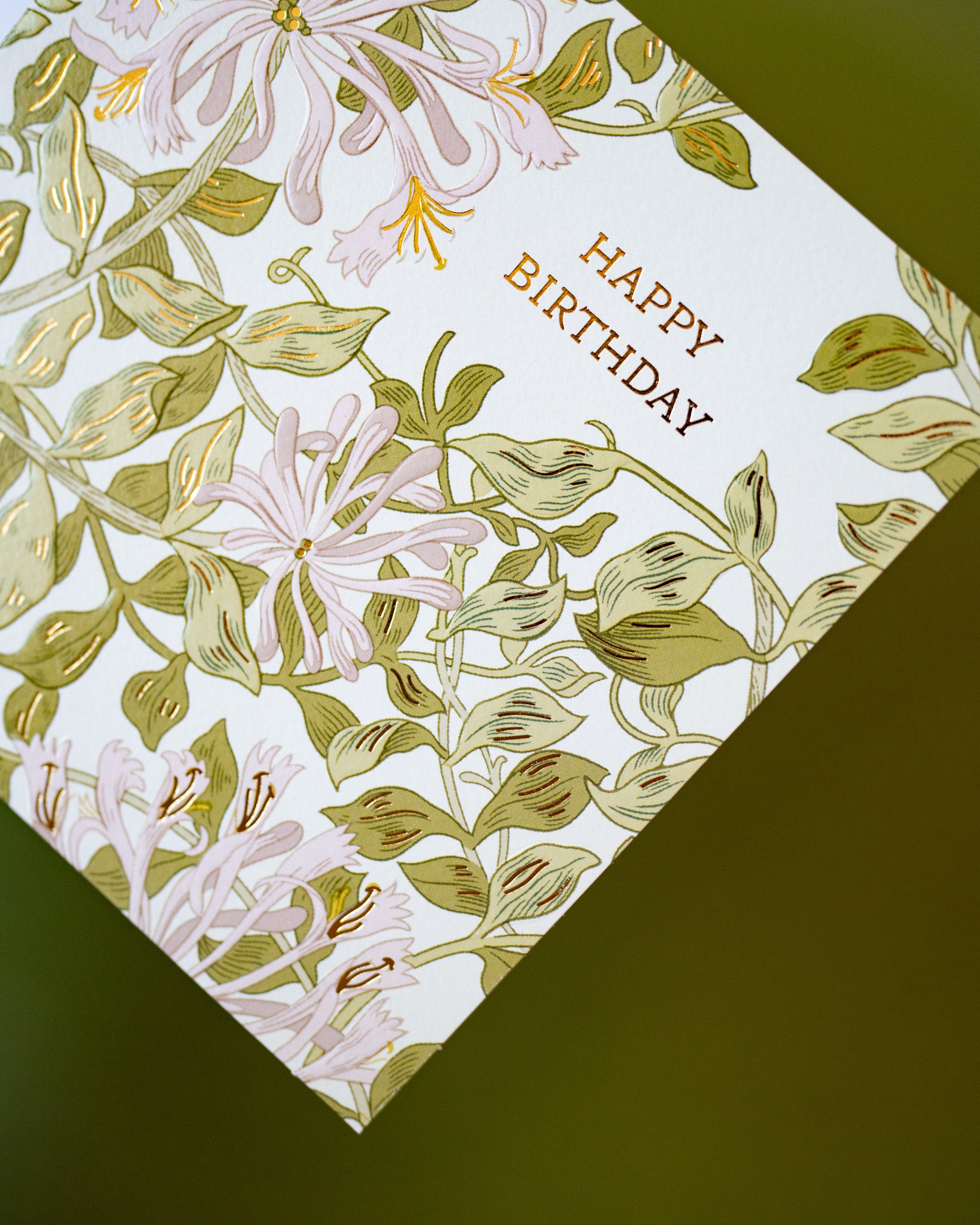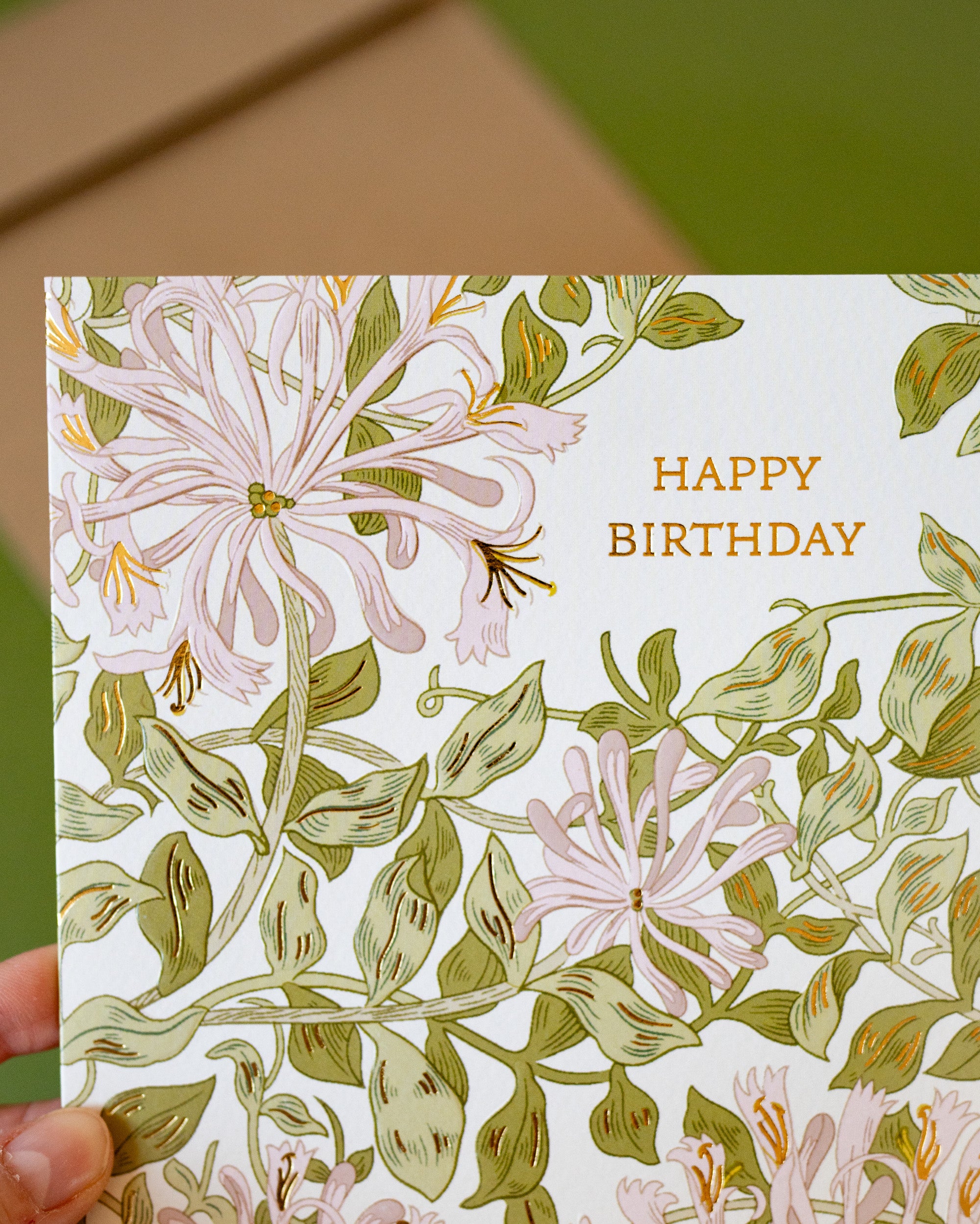 Sublime carte d’anniversaire qui reprend le motif chèvrefeuille imaginé par William Morris.