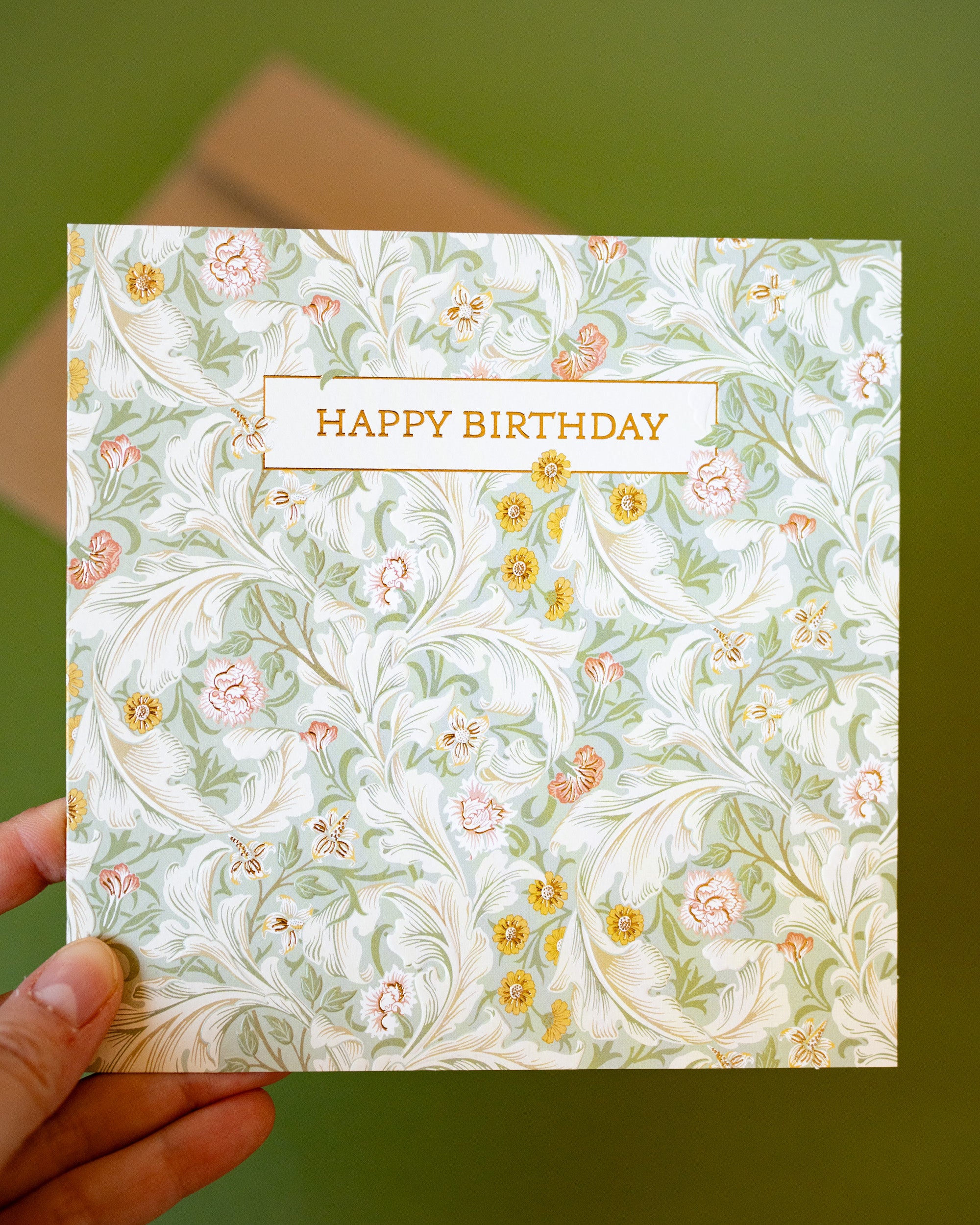 Sublime carte d’anniversaire qui reprend le motif Leicester imaginé par William Morris.