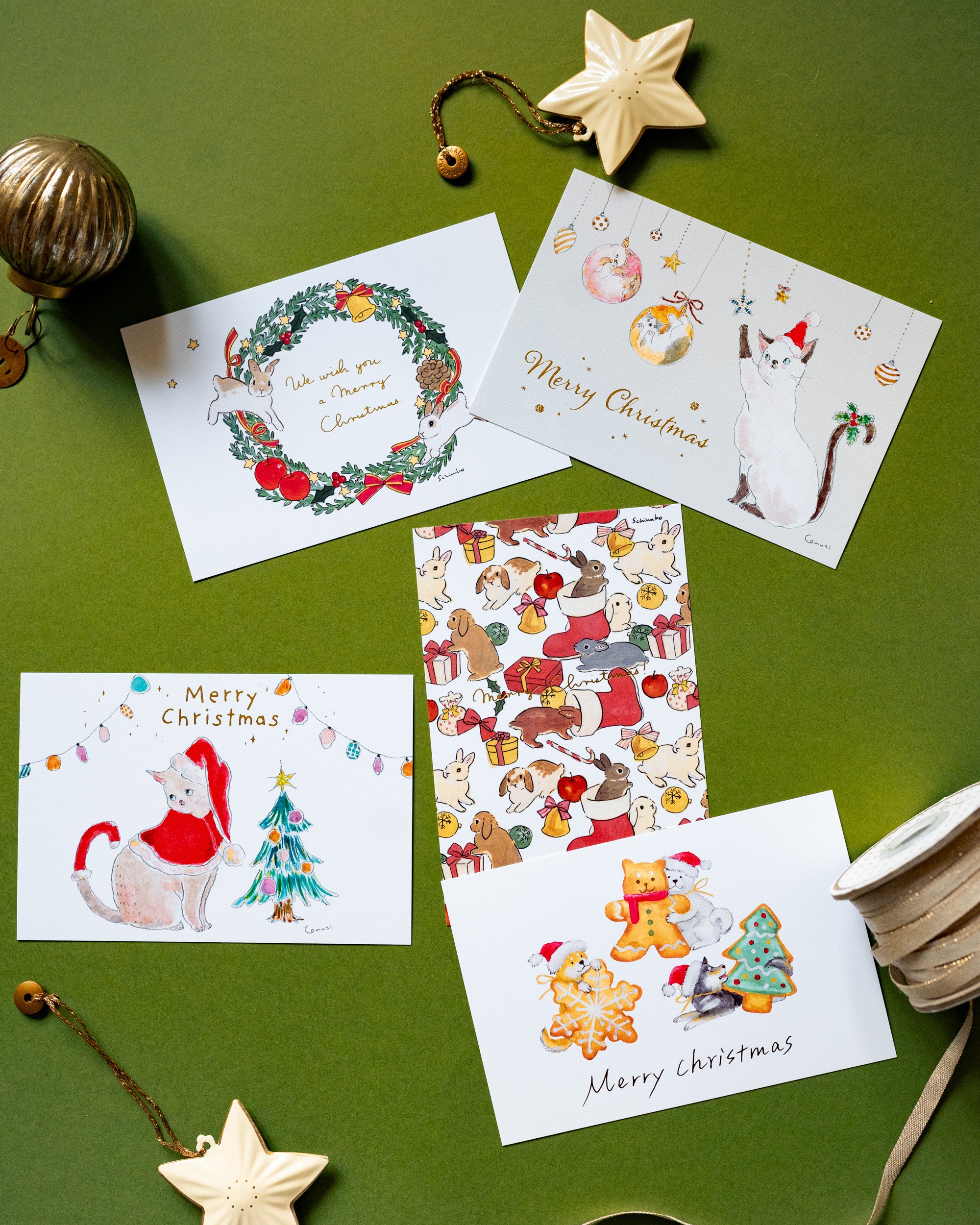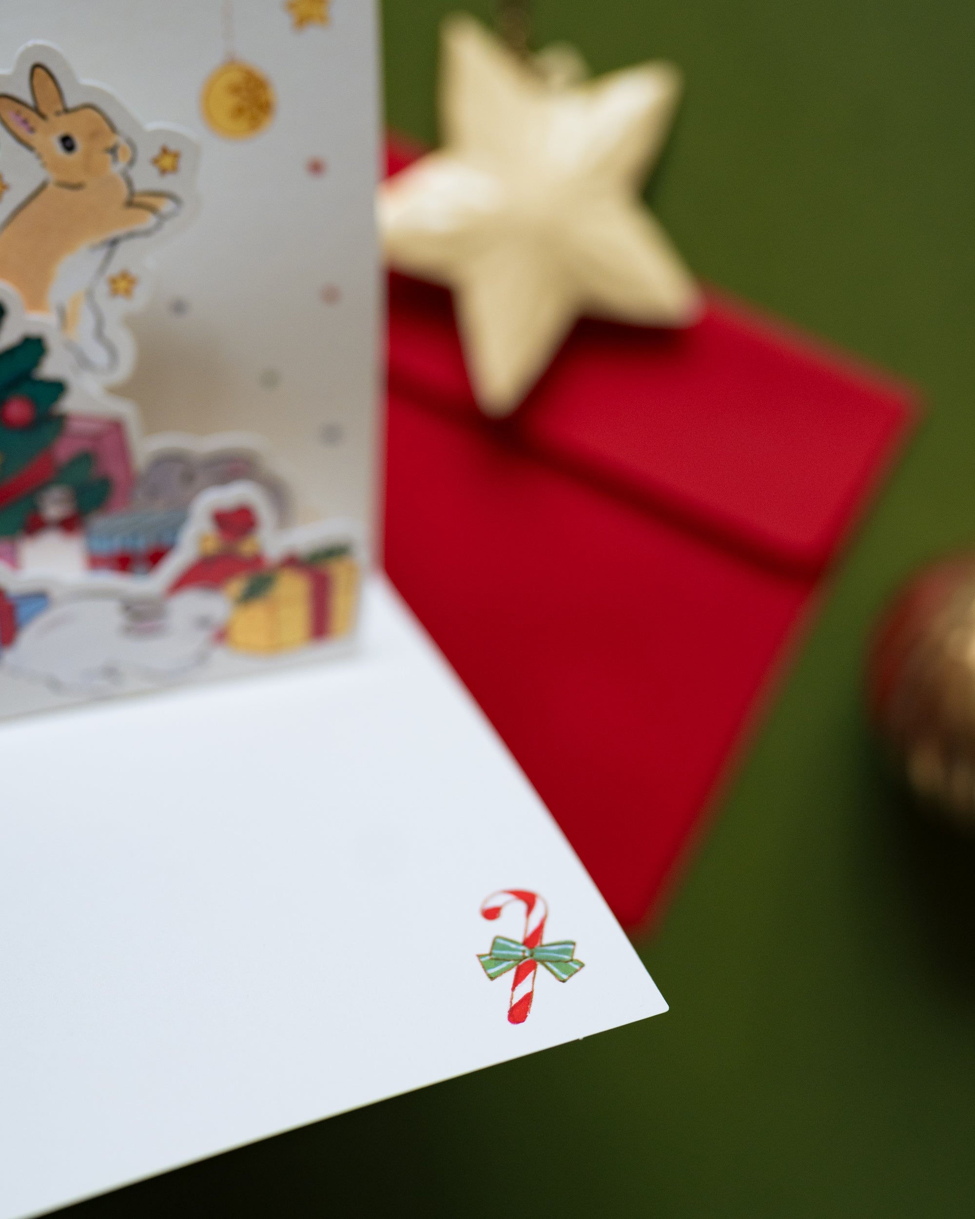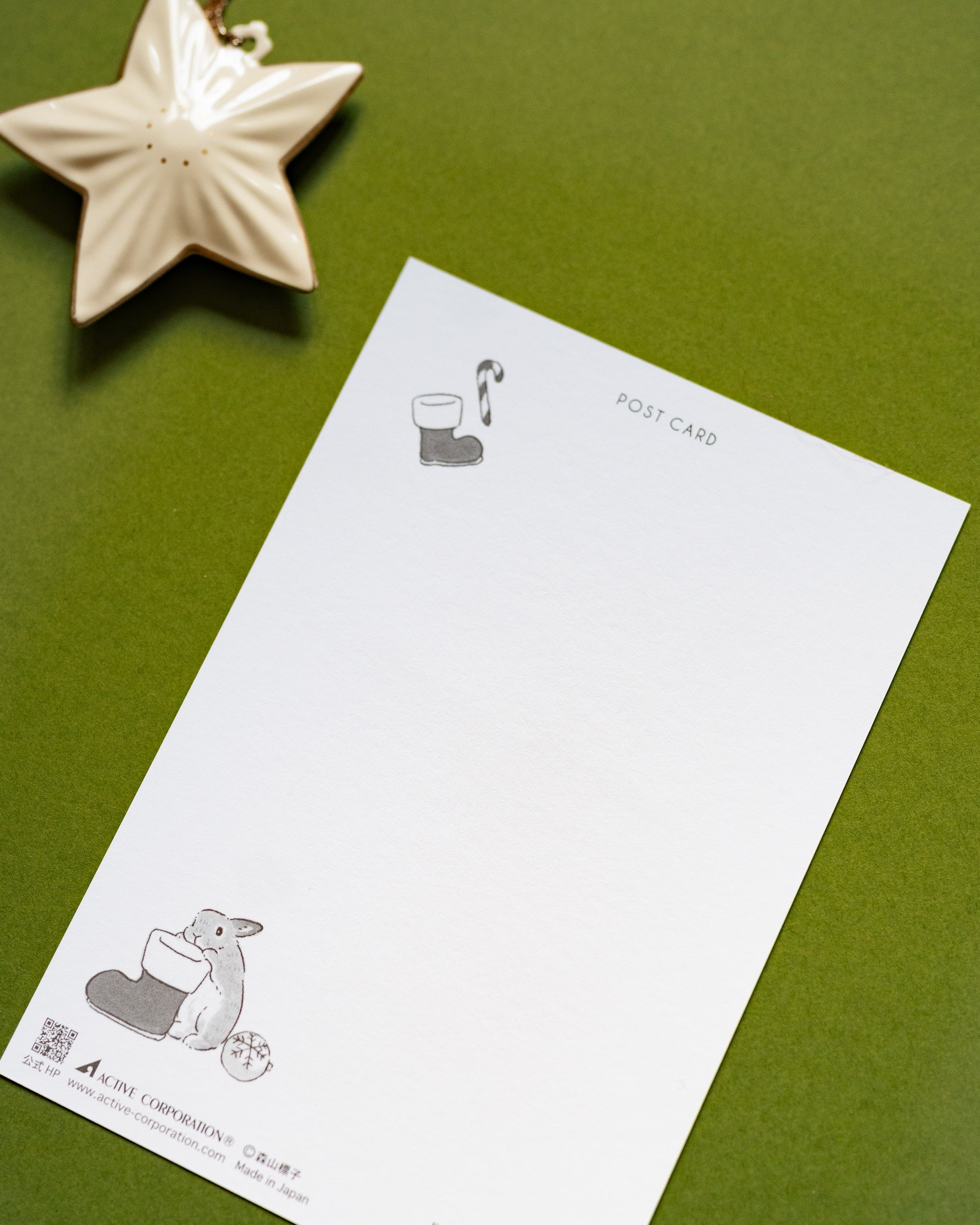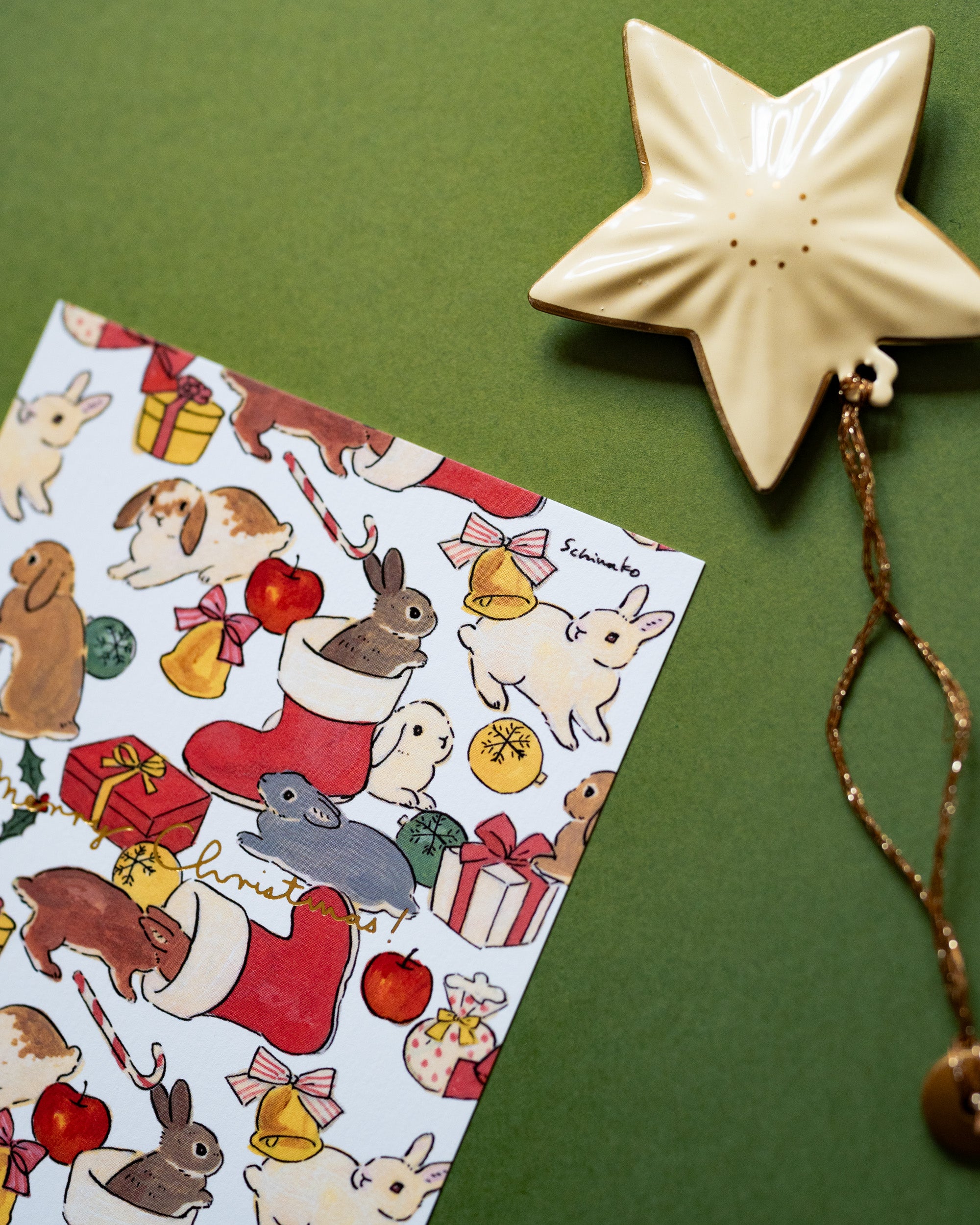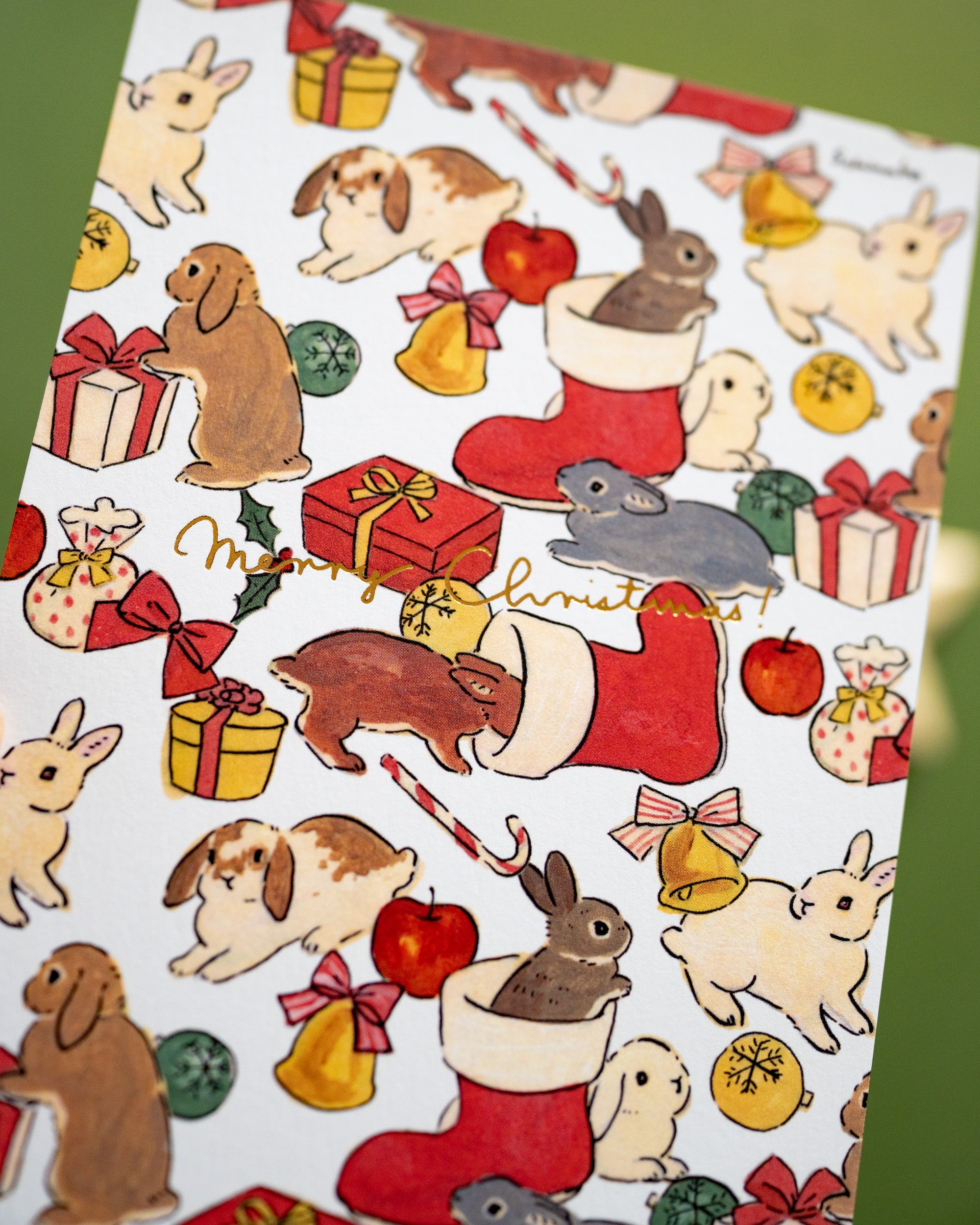 Cette carte illustrée par Shigeko Moriyama représente d’adorables lapins cachés au milieu de cadeaux de Noël. C’est le choix parfait pour accompagner un cadeau ou transmettre vos vœux de Joyeux Noël à vos proches.