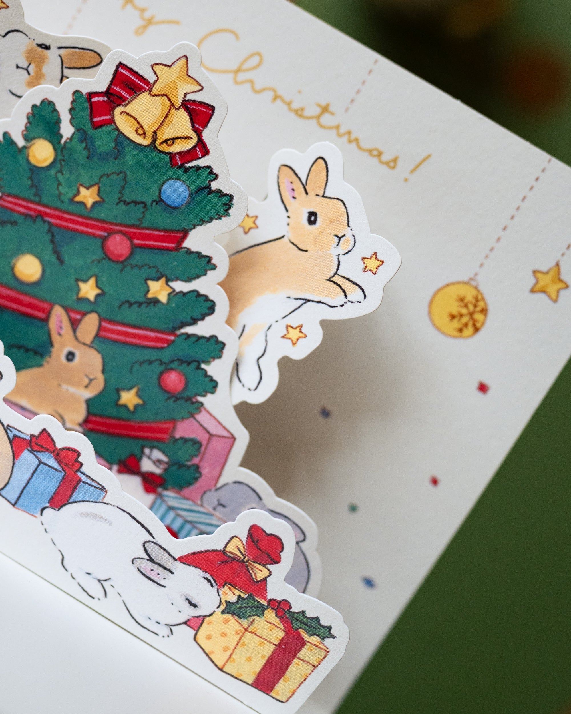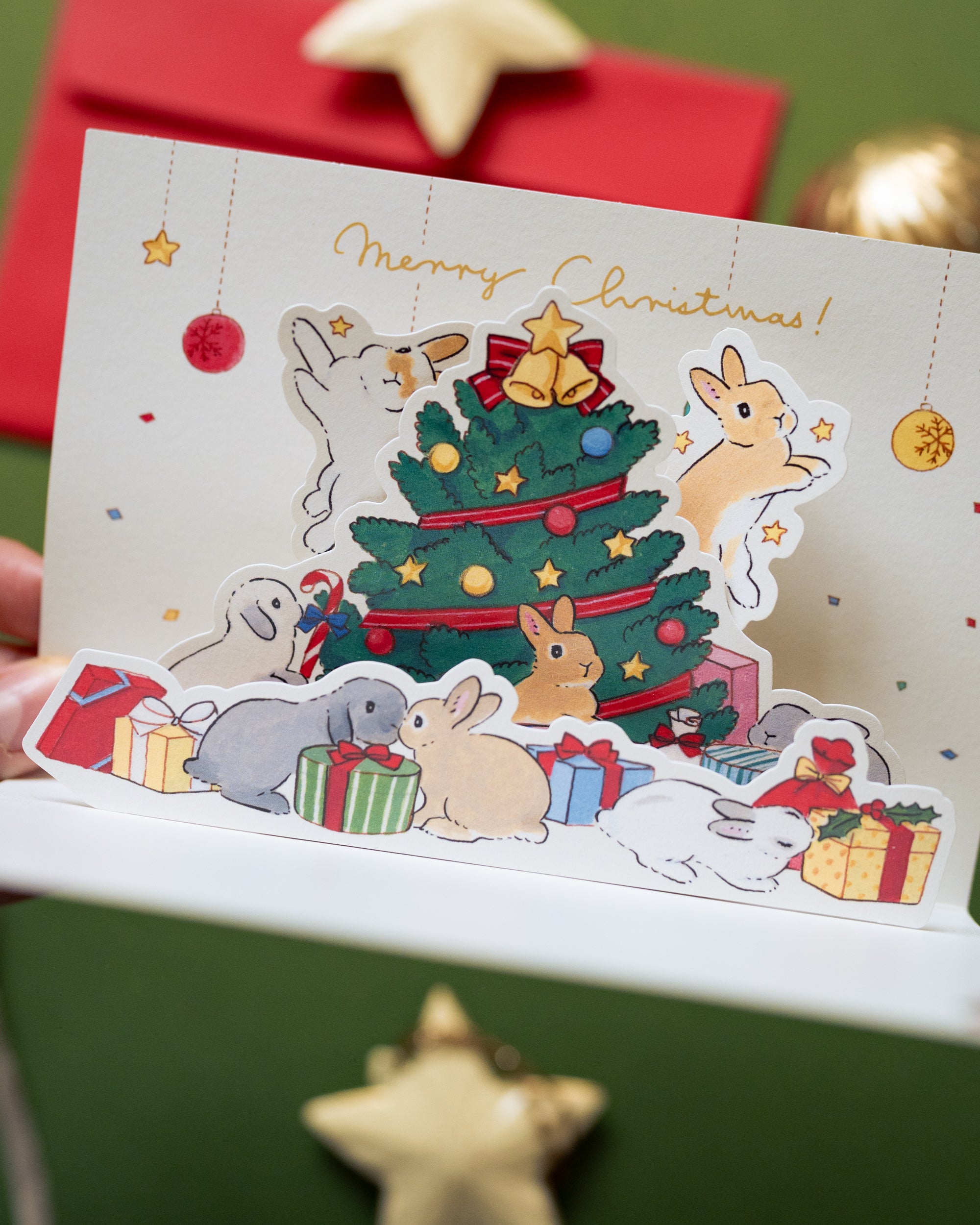 Apportez une touche de magie à vos fêtes de fin d’année avec cette magnifique carte de Noël pop-up. Illustrée par Shigeko Moriyama, talentueuse artiste spécialisée dans les dessins de lapins, elle dévoile des lapins espiègles surgissant aux côtés d’un sapin de Noël. Parfaite pour accompagner vos vœux ou sublimer vos cadeaux, cette carte est une manière originale et attendrissante de transmettre votre message de Joyeux Noël.