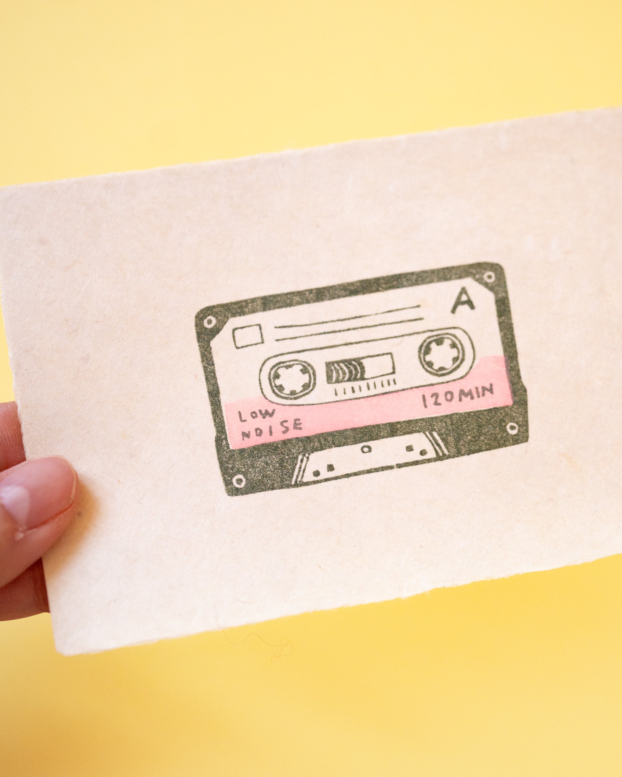 Découvrez cette carte unique, réalisée avec passion par Yoshie, fondatrice de la marque artisanale Hankodori. Sur un papier japonais épais au format carte postale, Yoshie a soigneusement appliqué, en plusieurs étapes, des motifs d’une cassette à l’aide de tampons qu’elle a elle-même sculptés. Idéale pour accompagner un présent ou à encadrer pour une touche décorative originale.