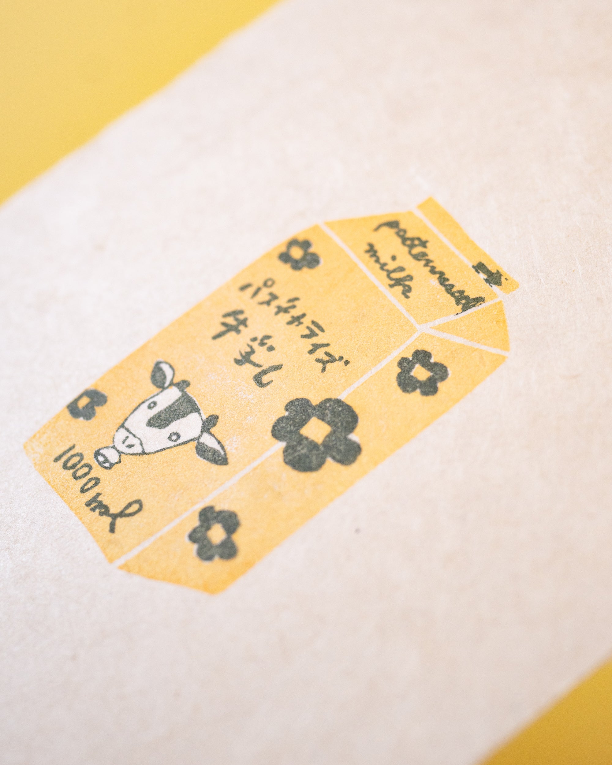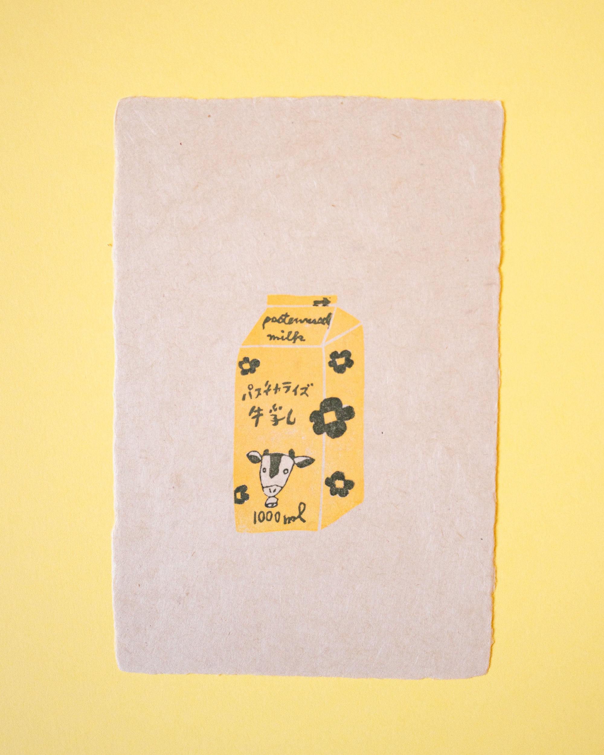 Découvrez cette carte unique, réalisée avec passion par Yoshie, fondatrice de la marque artisanale Hankodori. Sur un papier japonais épais au format carte postale, Yoshie a soigneusement appliqué, en plusieurs étapes, des motifs d’une brique de lait à l’aide de tampons qu’elle a elle-même sculptés. Idéale pour accompagner un présent ou à encadrer pour une touche décorative originale.