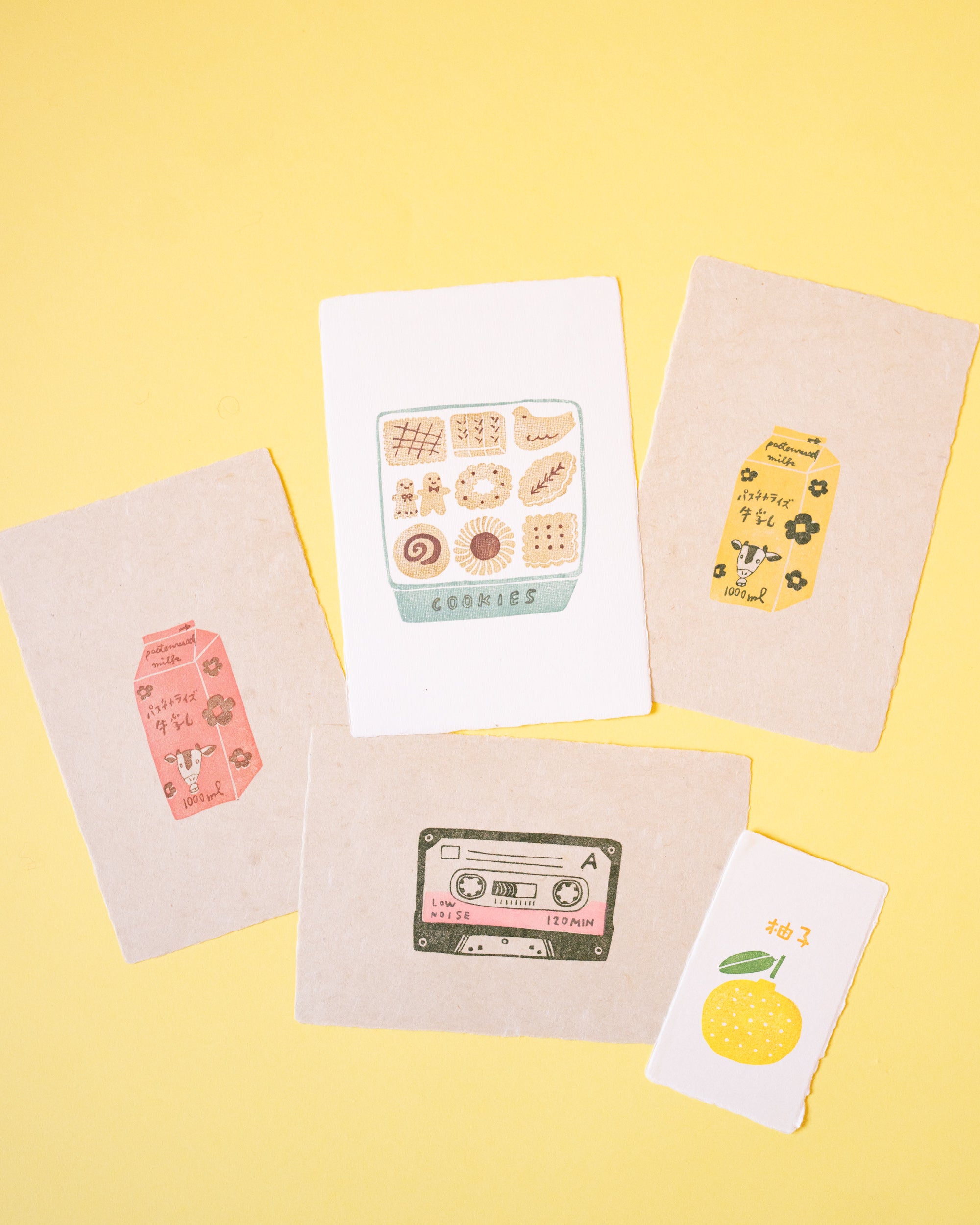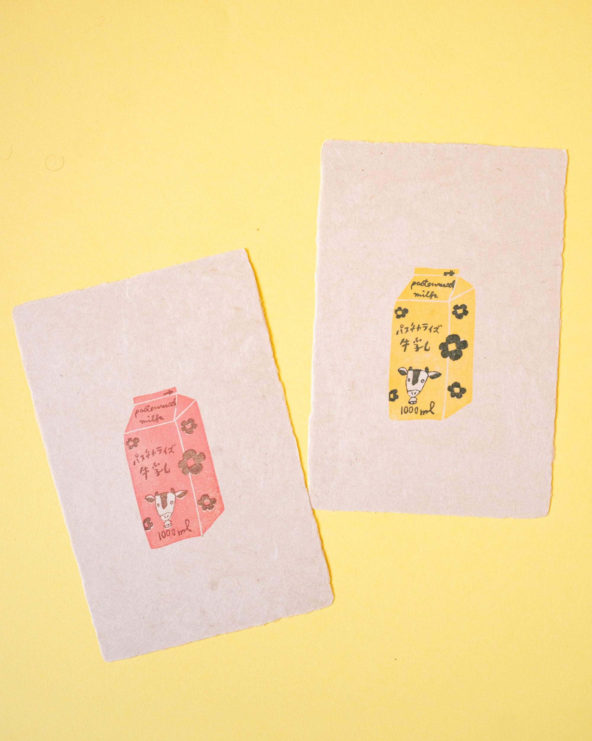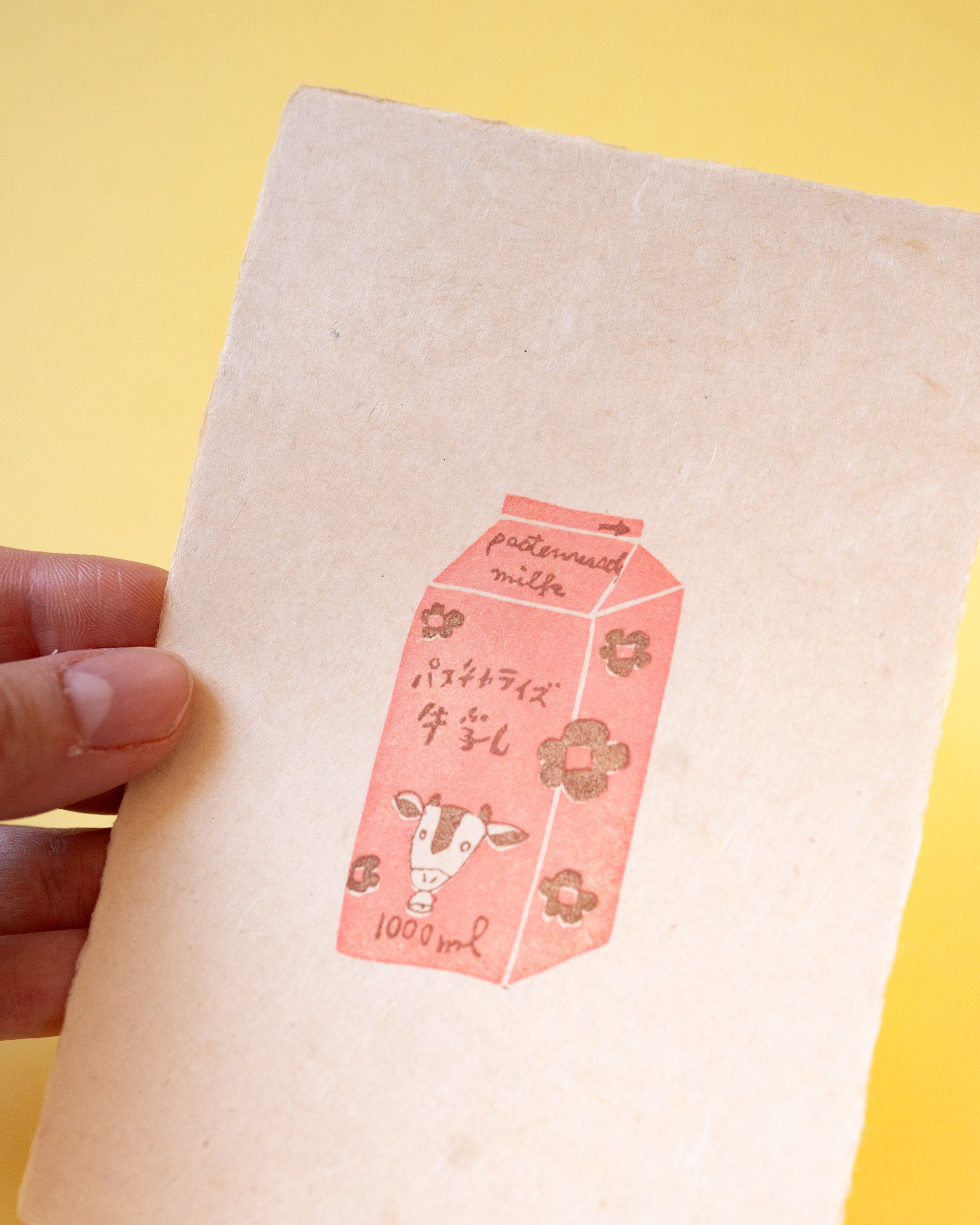Découvrez cette carte unique, réalisée avec passion par Yoshie, fondatrice de la marque artisanale Hankodori. Sur un papier japonais épais au format carte postale, Yoshie a soigneusement appliqué, en plusieurs étapes, des motifs d’une brique de lait à l’aide de tampons qu’elle a elle-même sculptés. Idéale pour accompagner un présent ou à encadrer pour une touche décorative originale.