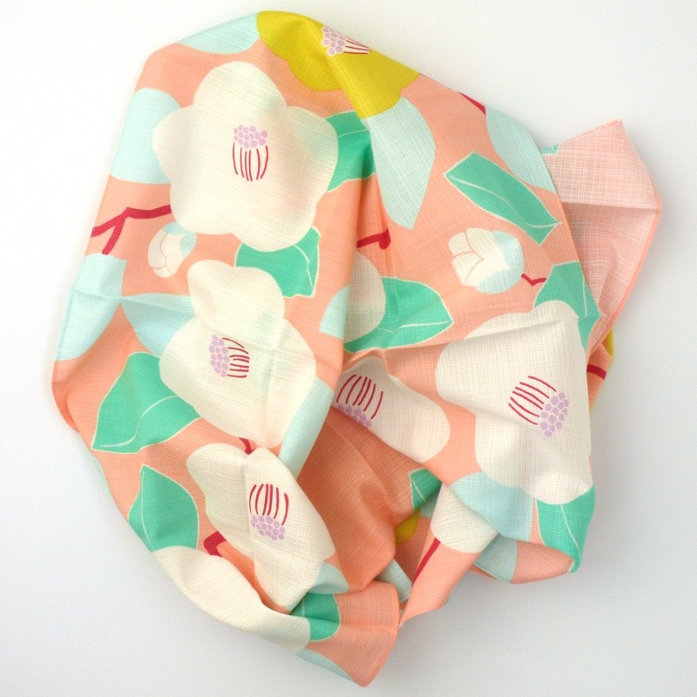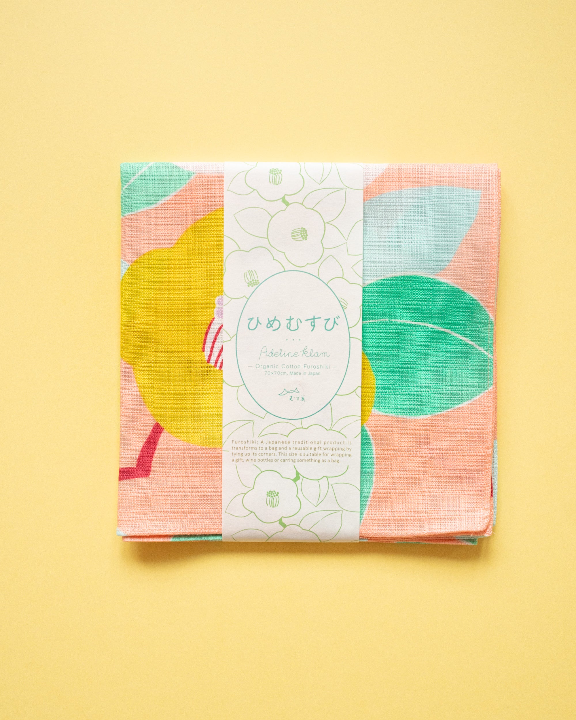 La série de furoshiki “Hime Musubi” a été créée en collaboration avec Adeline Klam, une designer française résidant à Paris. Passionnée par les motifs et les couleurs, Adeline revisite avec élégance les traditions japonaises en y ajoutant une touche contemporaine. Ce furoshiki en coton bio présente des motifs de camélia, une fleur sacrée au Japon qui annonce l’arrivée du printemps, lui conférant un style à la fois moderne et sophistiqué. Il est tout aussi beau lorsqu’il est déployé en décoration murale que lorsqu’il sert à emballer des cadeaux ou se transforme en sac.