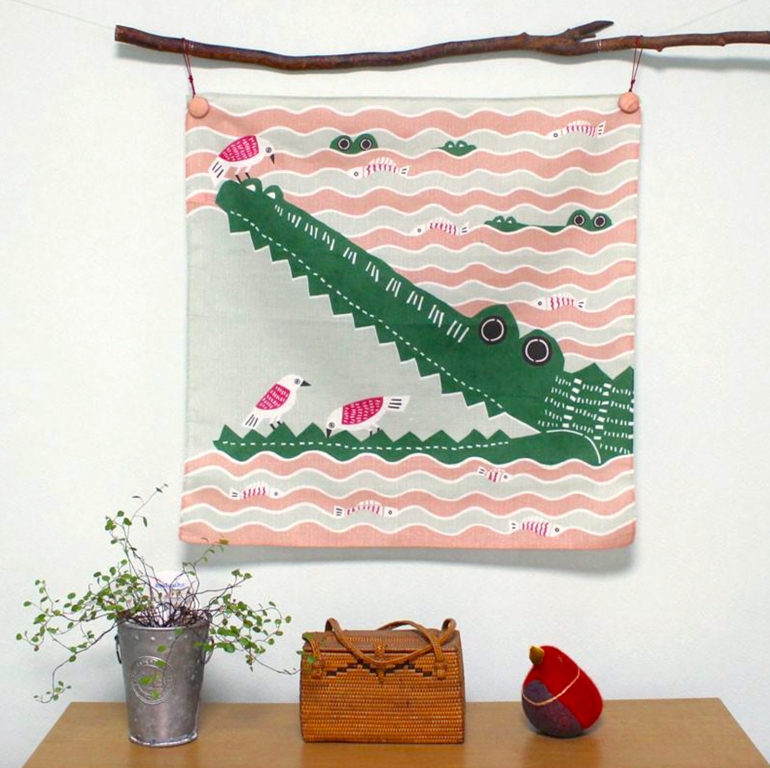 Ce furoshiki présente une scène adorable où un crocodile, allongé dans l’eau, se fait nettoyer les dents par ses amis oiseaux, une illustration pleine de tendresse et d’humour.