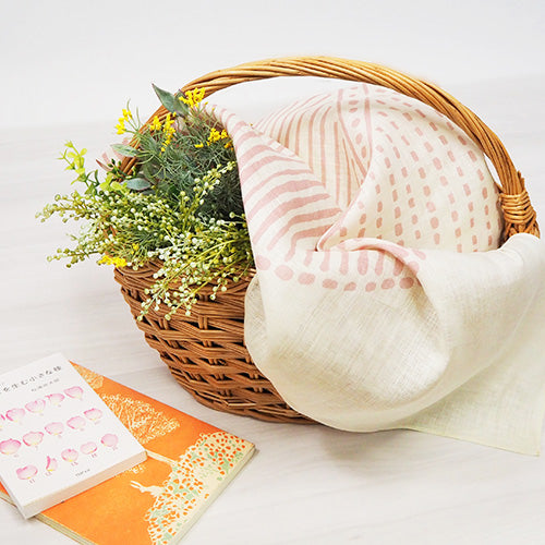 Le design de ce furoshiki illustre magnifiquement une scène où des graines plantées avec soin sur des collines accueillent la saison des récoltes. Les variations de couleur créées par la longueur et l’espacement des lignes offrent un rendu unique, et l’apparence du motif évolue selon la façon de plier ou de nouer le tissu. Ce furoshiki prend une dimension particulière lorsqu’il est utilisé comme sac.