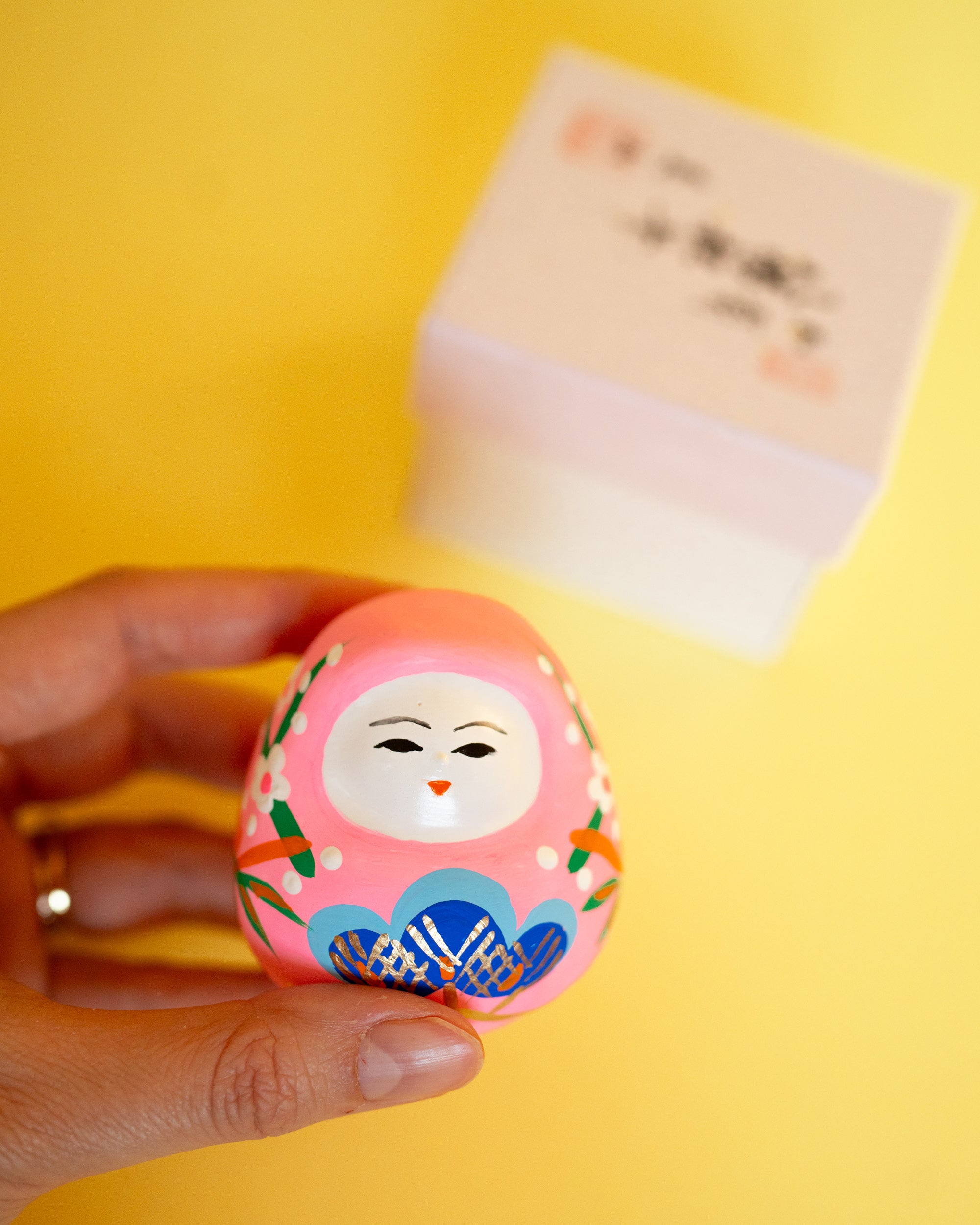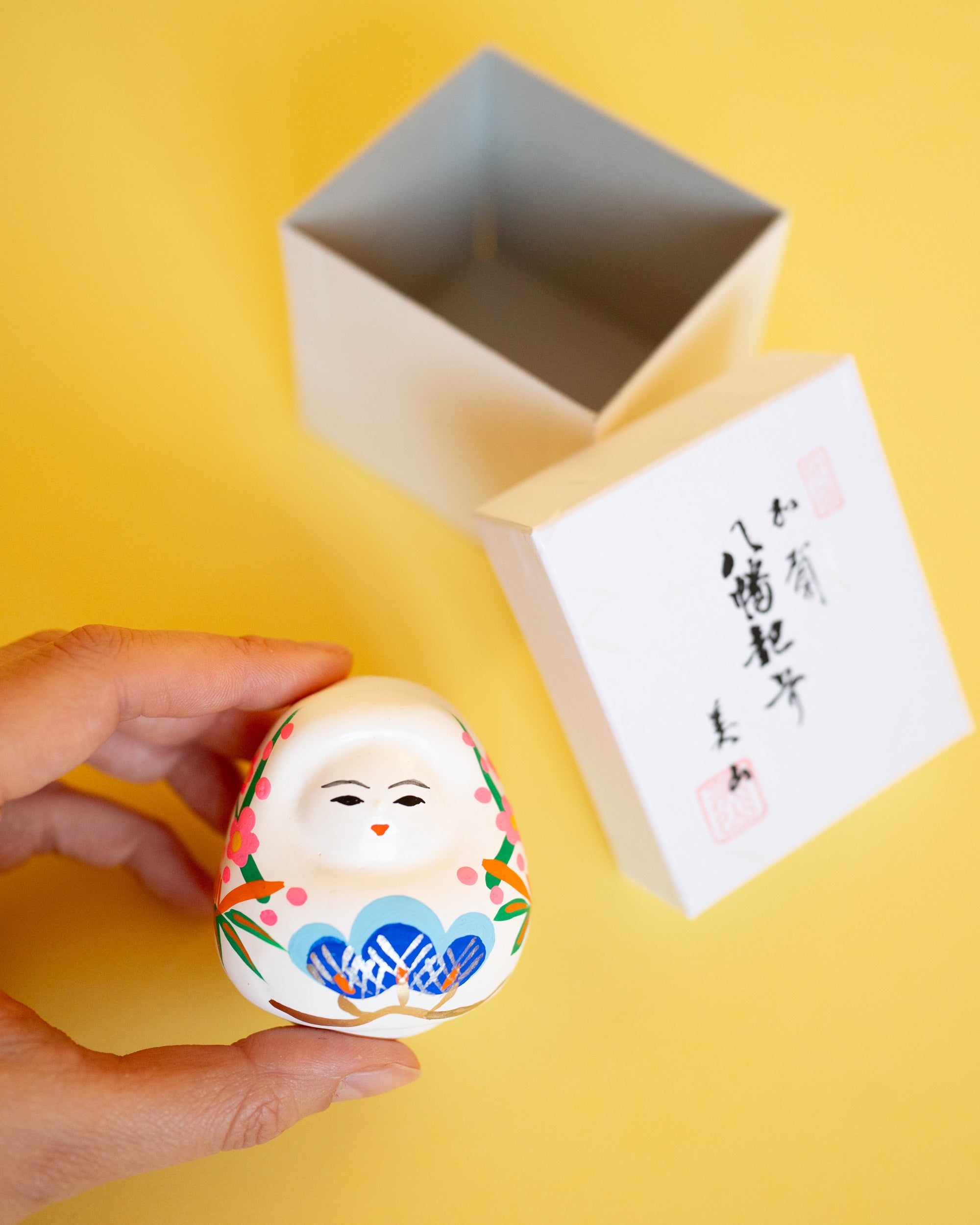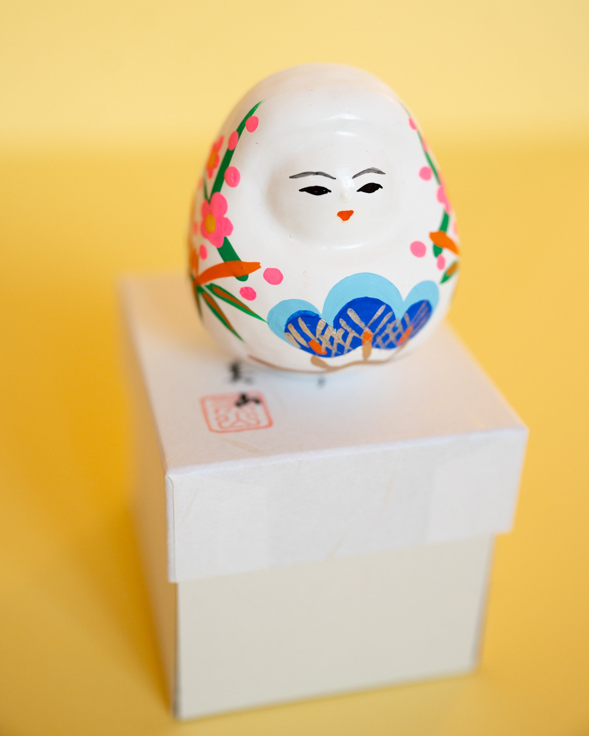 Ce porte-bonheur japonais, connu sous le nom de Kaga Hachiman Okiagari, est fabriqué de manière artisanale à Kanazawa. Chaque pièce est peinte à la main et arbore les trois symboles de la chance au Japon : le pin, le bambou et les fleurs de prunier. Traditionnellement, il est offert pour célébrer une naissance, souhaiter un mariage heureux, accompagner un proche vers la guérison, ou simplement pour porter chance. En plus de sa signification symbolique, c’est un magnifique objet de décoration. Chaque pièce est livrée dans sa boîte et se décline en trois couleurs : blanc, rose et vert.