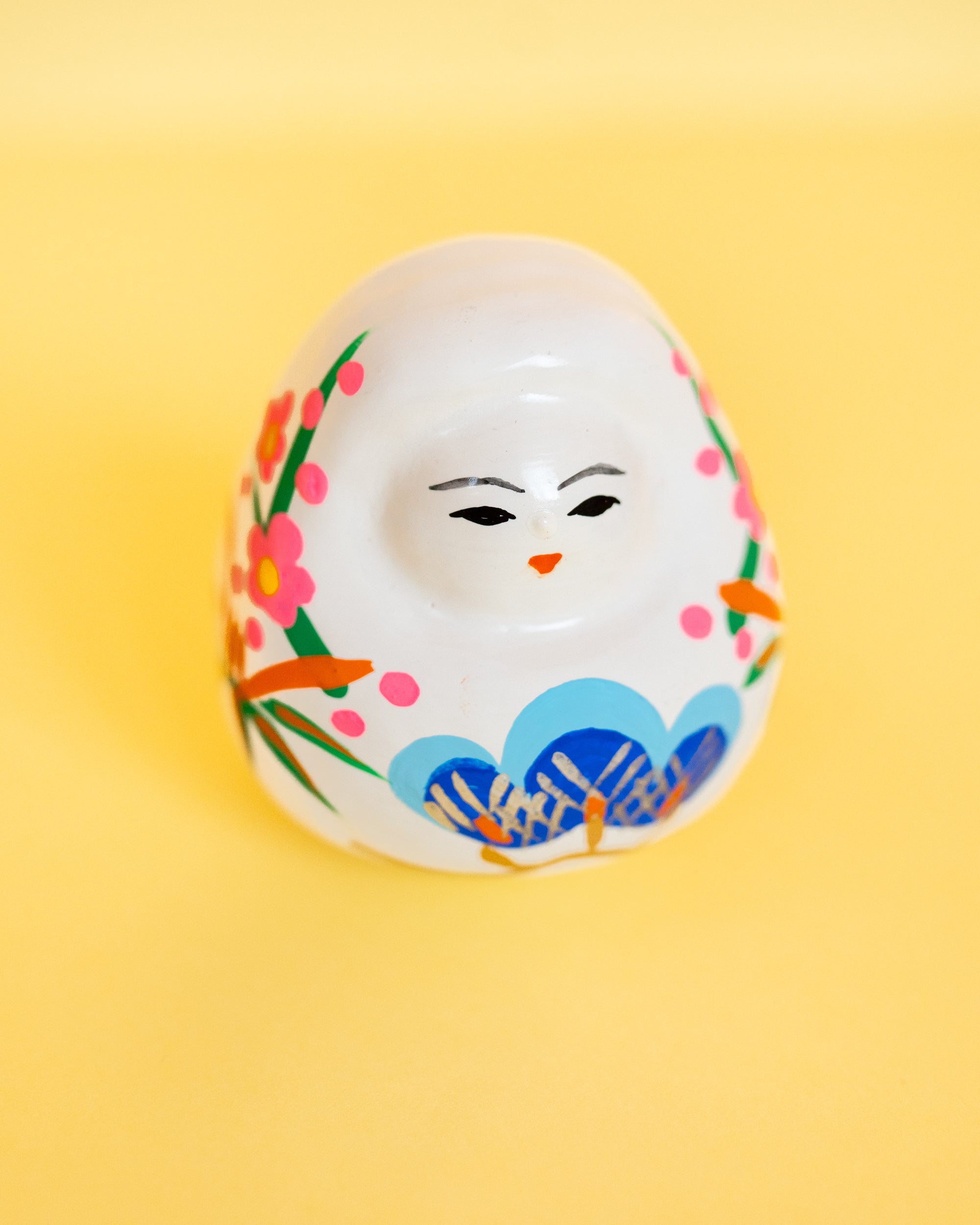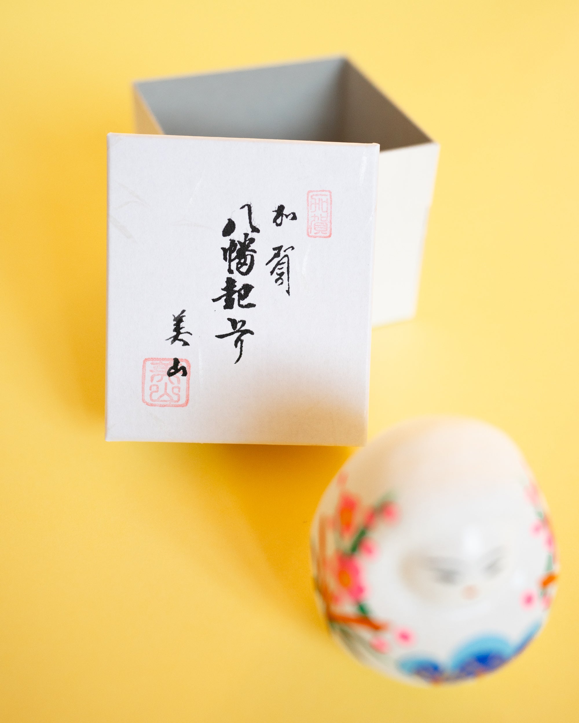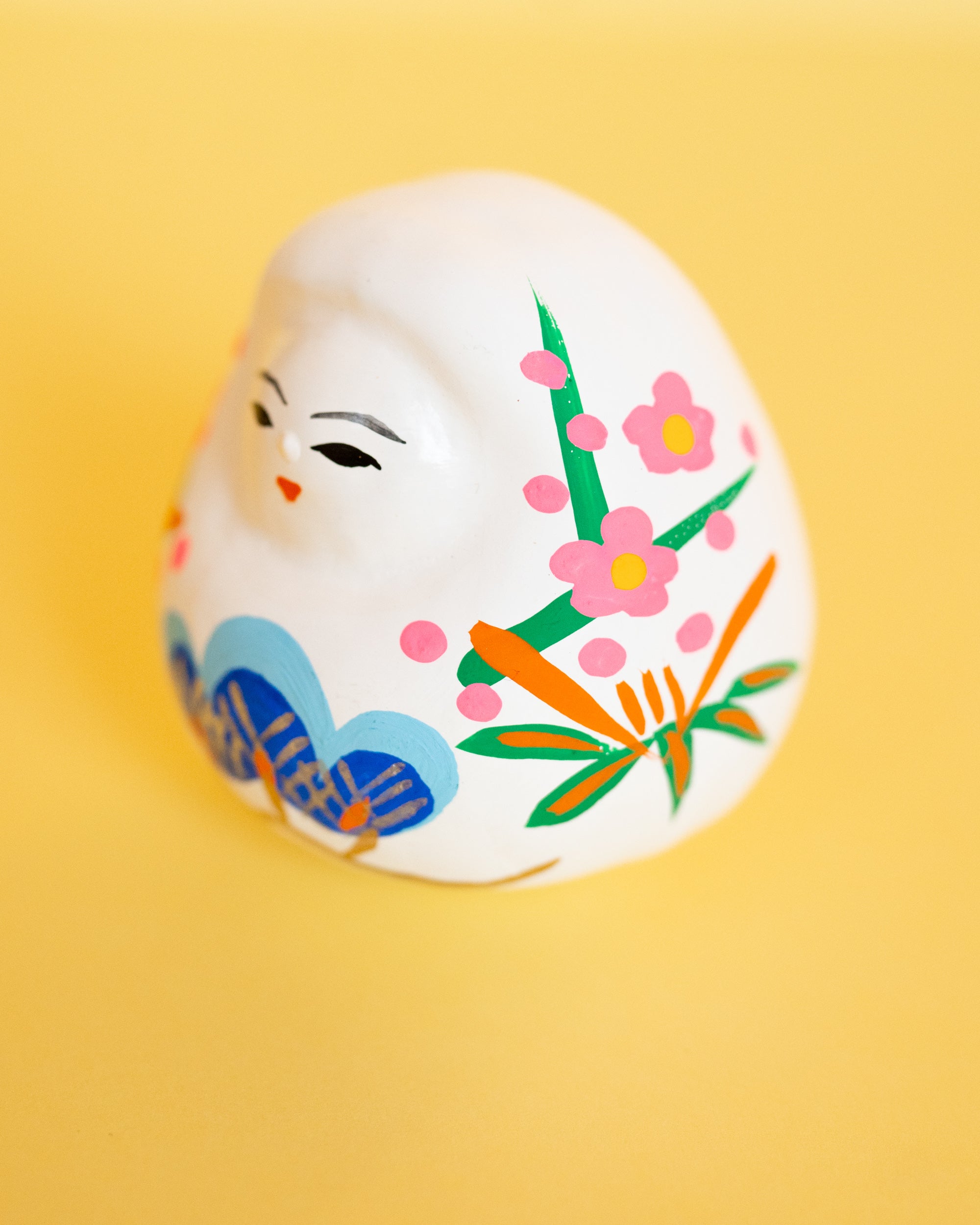 Ce porte-bonheur japonais, connu sous le nom de Kaga Hachiman Okiagari, est fabriqué de manière artisanale à Kanazawa. Chaque pièce est peinte à la main et arbore les trois symboles de la chance au Japon : le pin, le bambou et les fleurs de prunier. Traditionnellement, il est offert pour célébrer une naissance, souhaiter un mariage heureux, accompagner un proche vers la guérison, ou simplement pour porter chance. En plus de sa signification symbolique, c’est un magnifique objet de décoration. Chaque pièce est livrée dans sa boîte et se décline en trois couleurs : blanc, rose et vert.