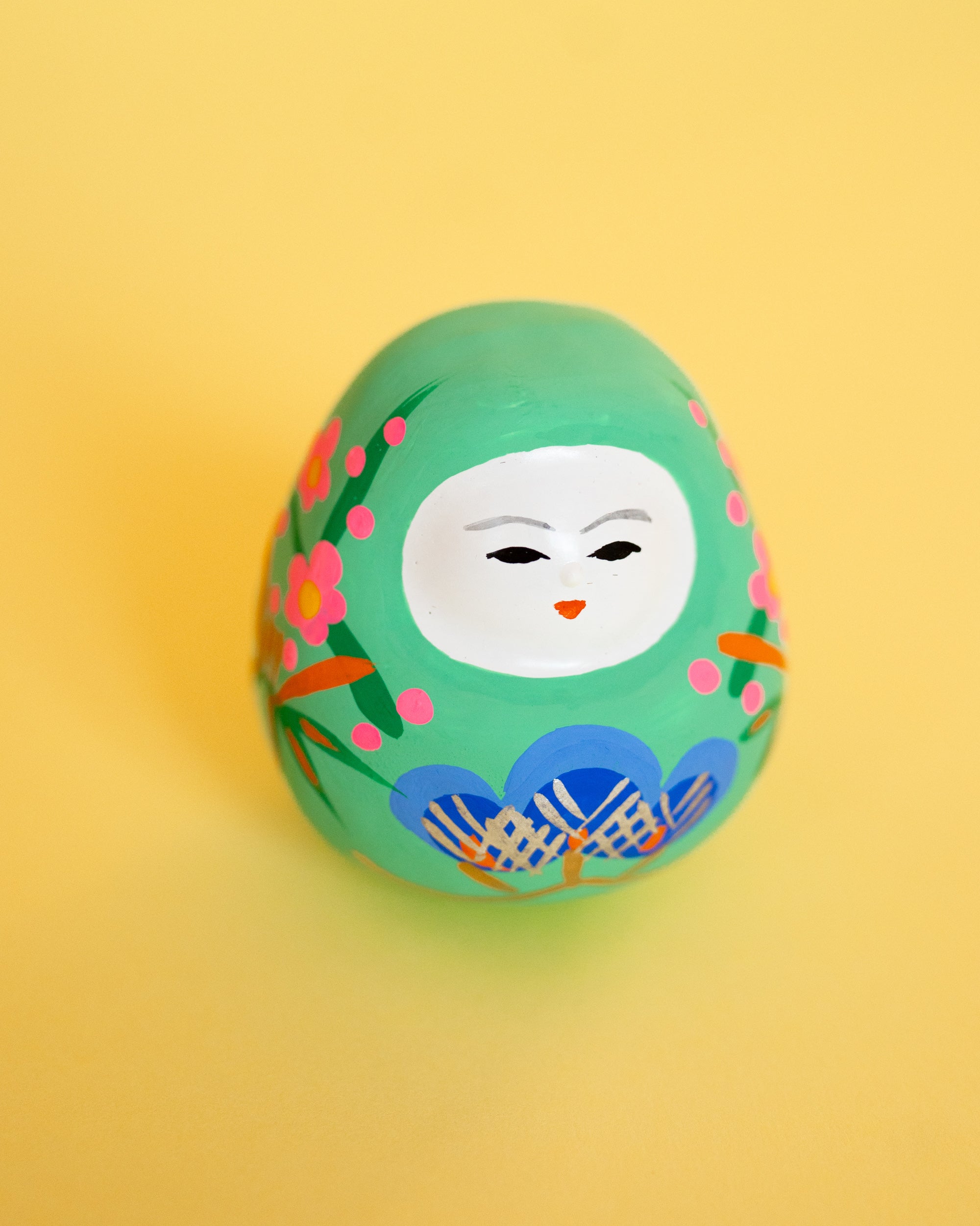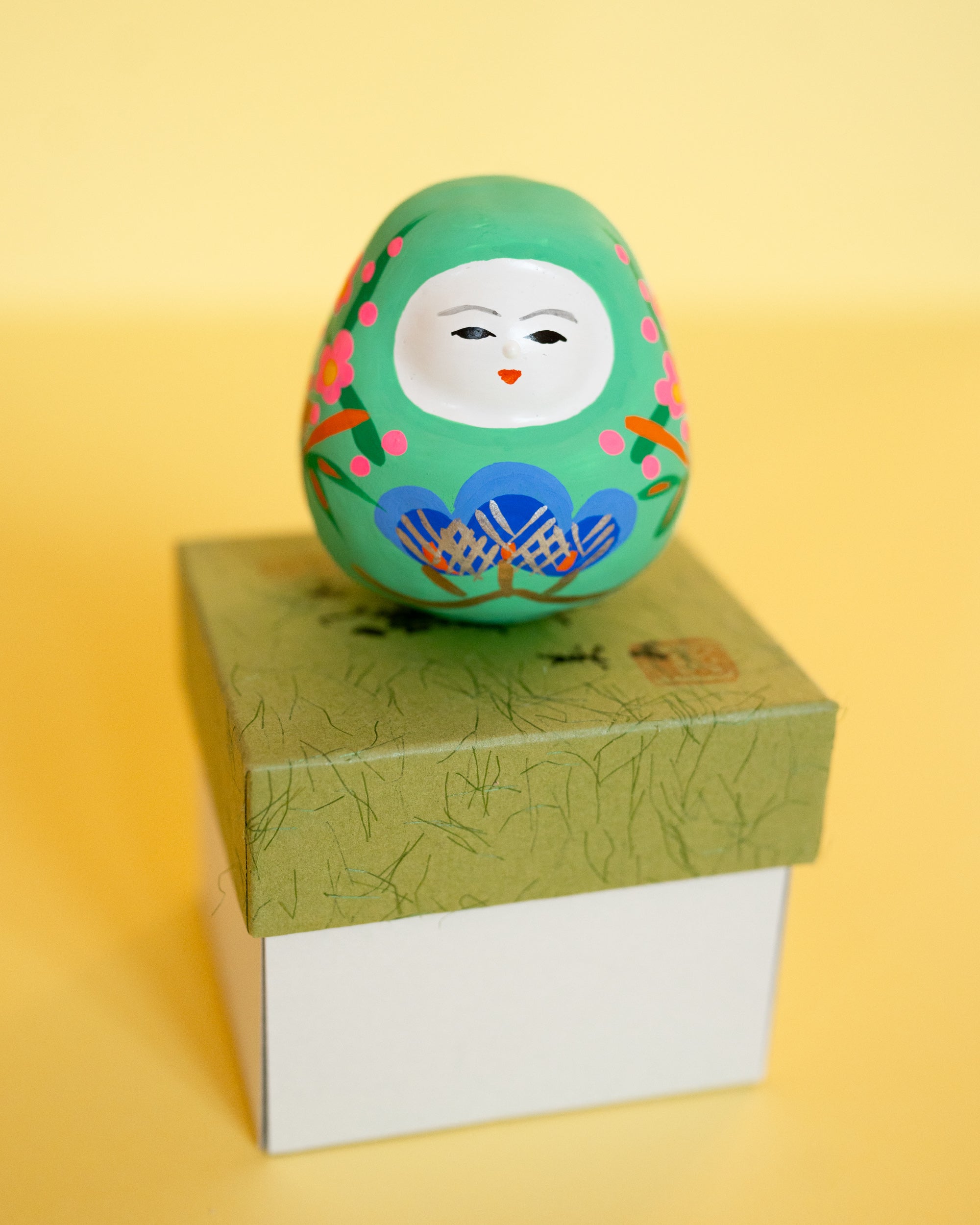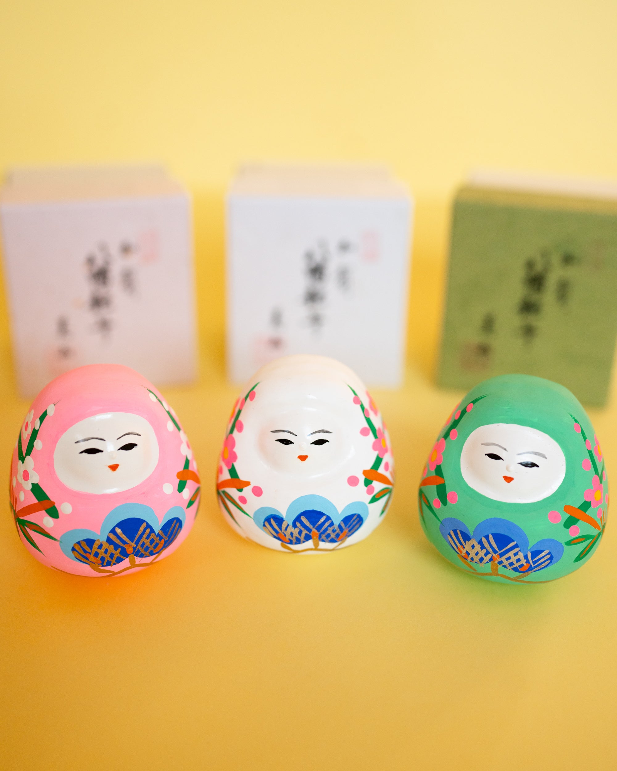 Ce porte-bonheur japonais, connu sous le nom de Kaga Hachiman Okiagari, est fabriqué de manière artisanale à Kanazawa. Chaque pièce est peinte à la main et arbore les trois symboles de la chance au Japon : le pin, le bambou et les fleurs de prunier. Traditionnellement, il est offert pour célébrer une naissance, souhaiter un mariage heureux, accompagner un proche vers la guérison, ou simplement pour porter chance. En plus de sa signification symbolique, c’est un magnifique objet de décoration. Chaque pièce est livrée dans sa boîte et se décline en trois couleurs : blanc, rose et vert.