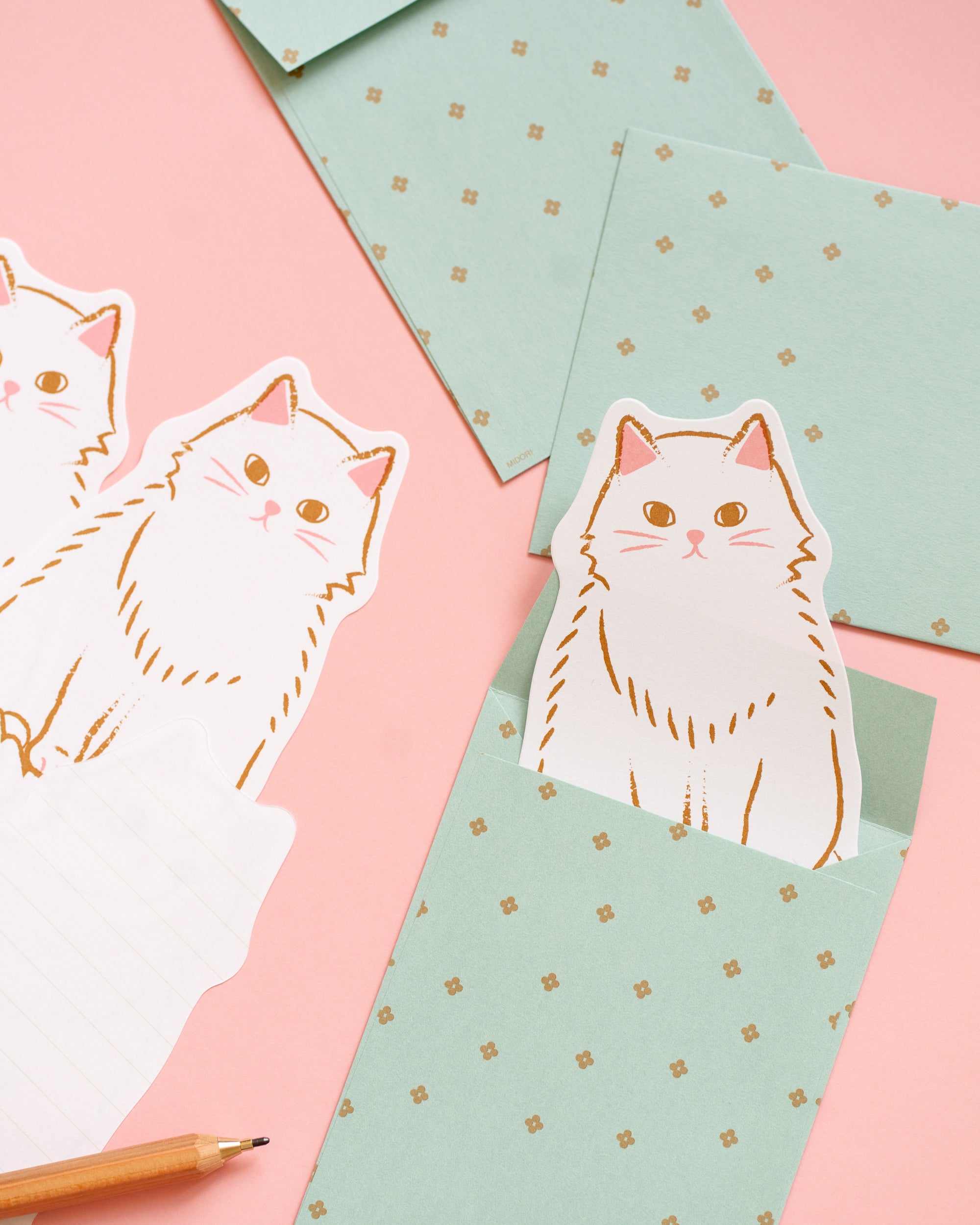 Miaoooou ! Comment ne pas craquer pour cet adorable set de papier à lettre ? Ce kit contient 6 feuilles joliment découpées en forme de chat, avec des lignes au verso pour écrire un petit mot, idéal pour glisser un message attentionné ou accompagner un cadeau. Le tout est complété par 3 élégantes enveloppes dans des teintes vert menthe à l’eau et doré, ajoutant une touche raffinée à vos correspondances.