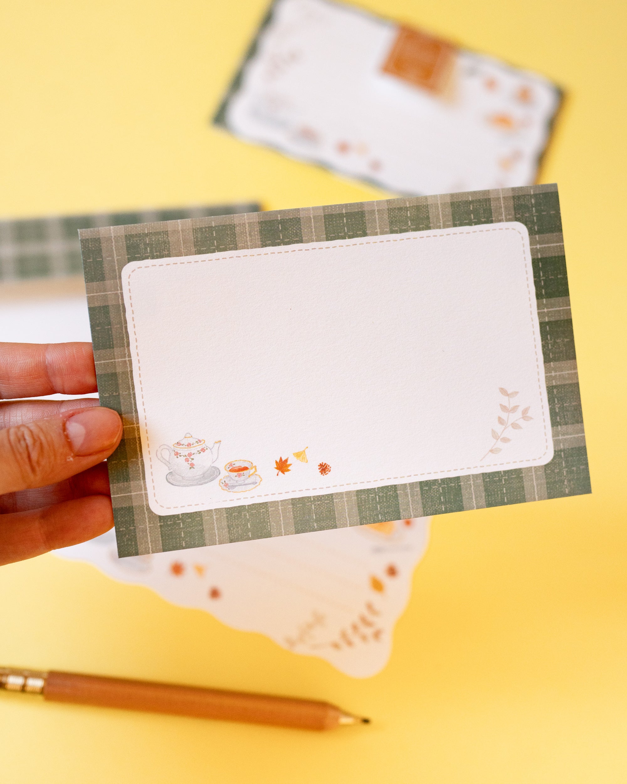 Ce mini set de papier à lettre représente un tea time en automne ultra cosy. Parfait pour des correspondances chaleureuses, il comprend 6 feuilles et 3 enveloppes.