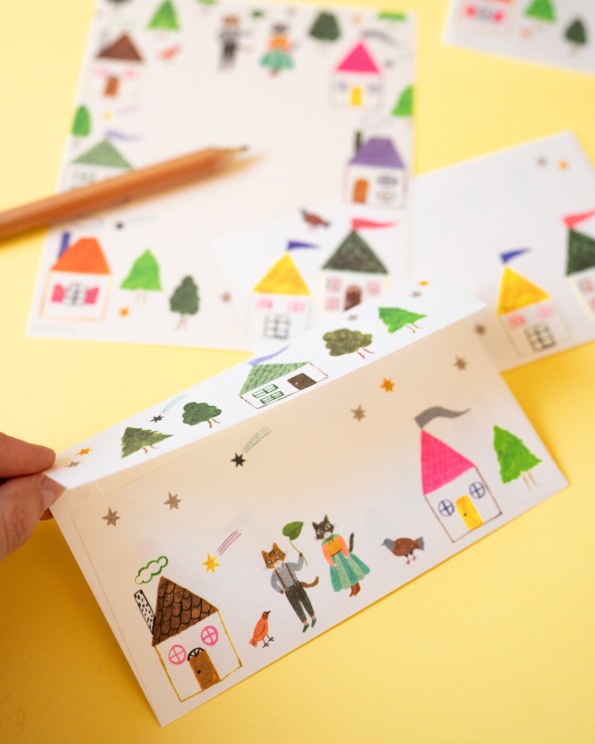 Ce magnifique set de correspondance illustré par Aiko Fukawa, met en scène un chat dans village de maisons colorées. Ce set comprend 12 feuilles de papier à lettre en papier mino washi, un papier japonais emblématique, 4 enveloppes assorties et une feuille lignée à glisser sous le papier pour garantir une écriture bien alignée. Un ensemble poétique et délicat, parfait pour les amoureux de papeterie raffinée.