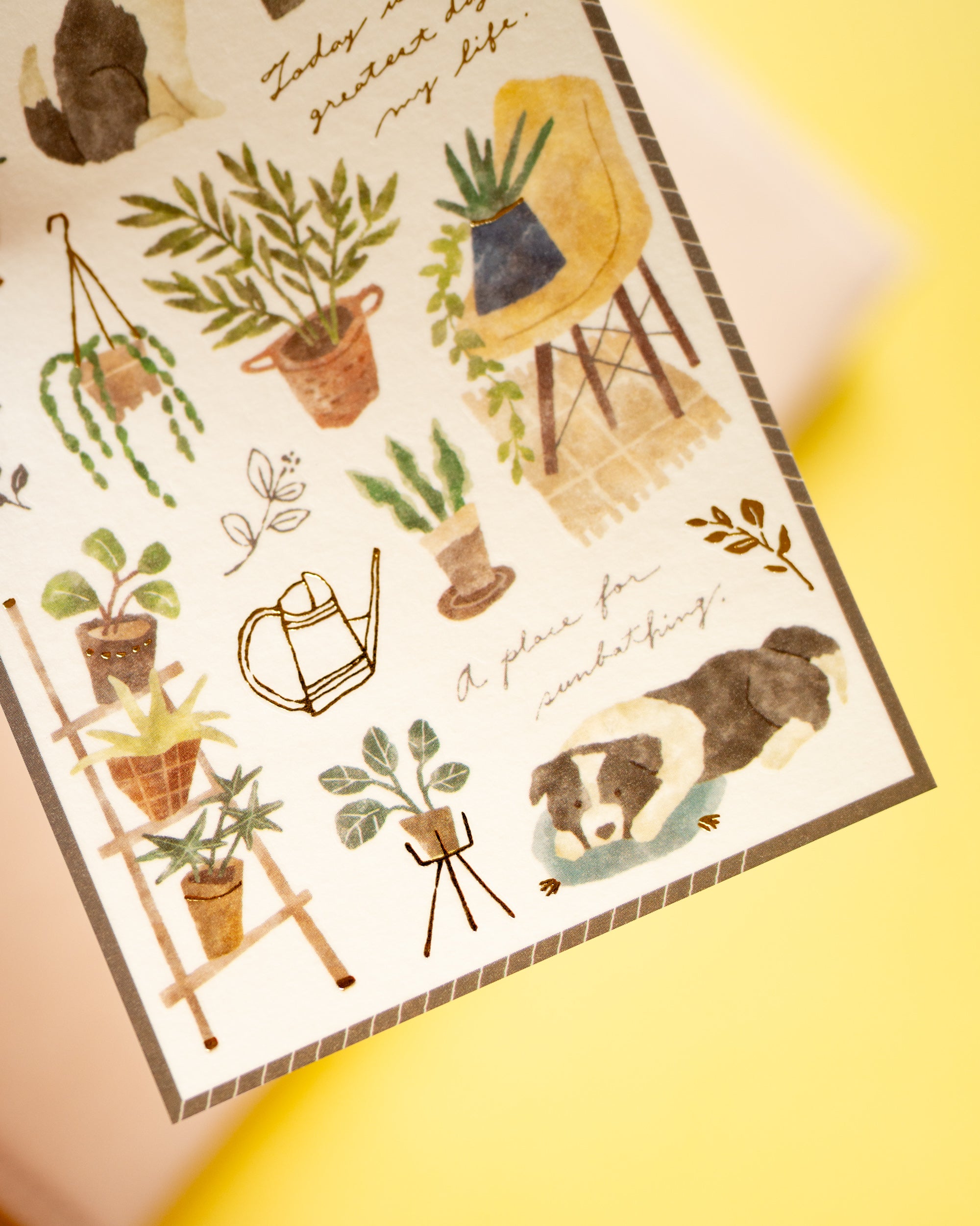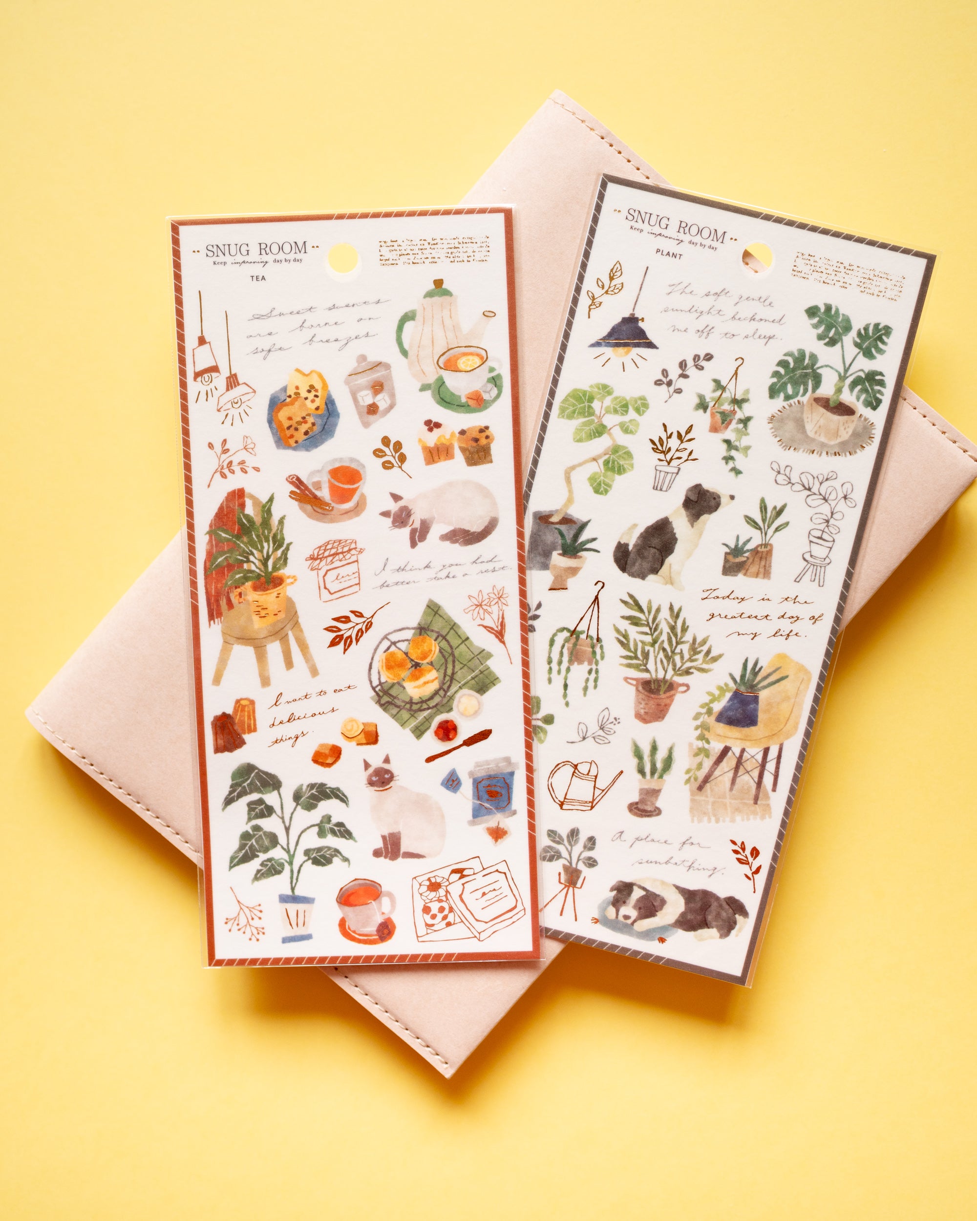 Les stickers washi Mind Wave Snug Room sont parfaits pour créer des pages de journal inspirantes. Chaque feuille de stickers washi présente un thème cosy, incluant un animal de compagnie vedette et quelques accents dorés.