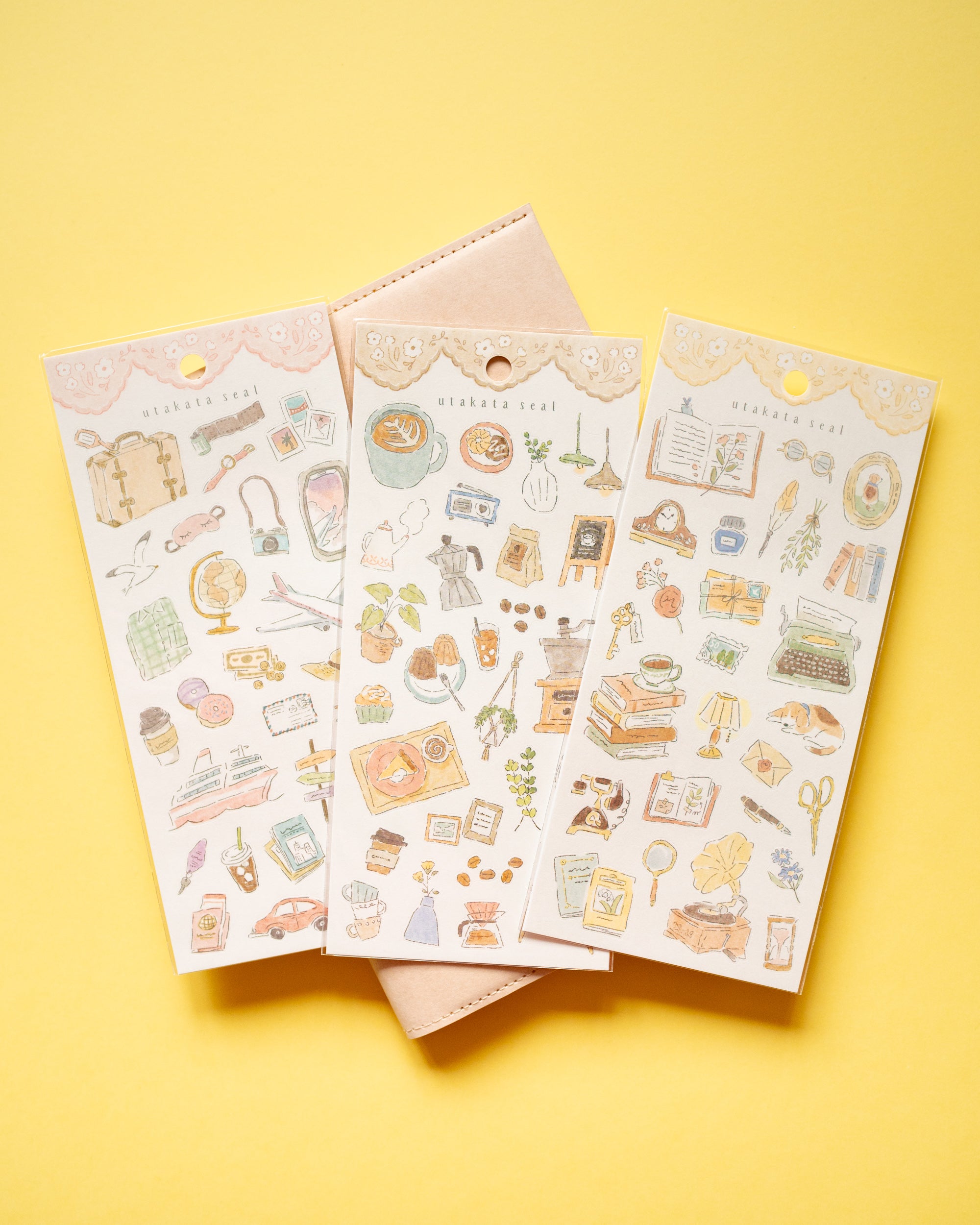 Les autocollants Utakata présentent un style crayonné léger et doux qui donne aux illustrations un aspect chaleureux. Chaque feuille de stickers contient environ 20 à 30 autocollants en papier, selon le design. Disponible en 3 designs différents sur la boutique.