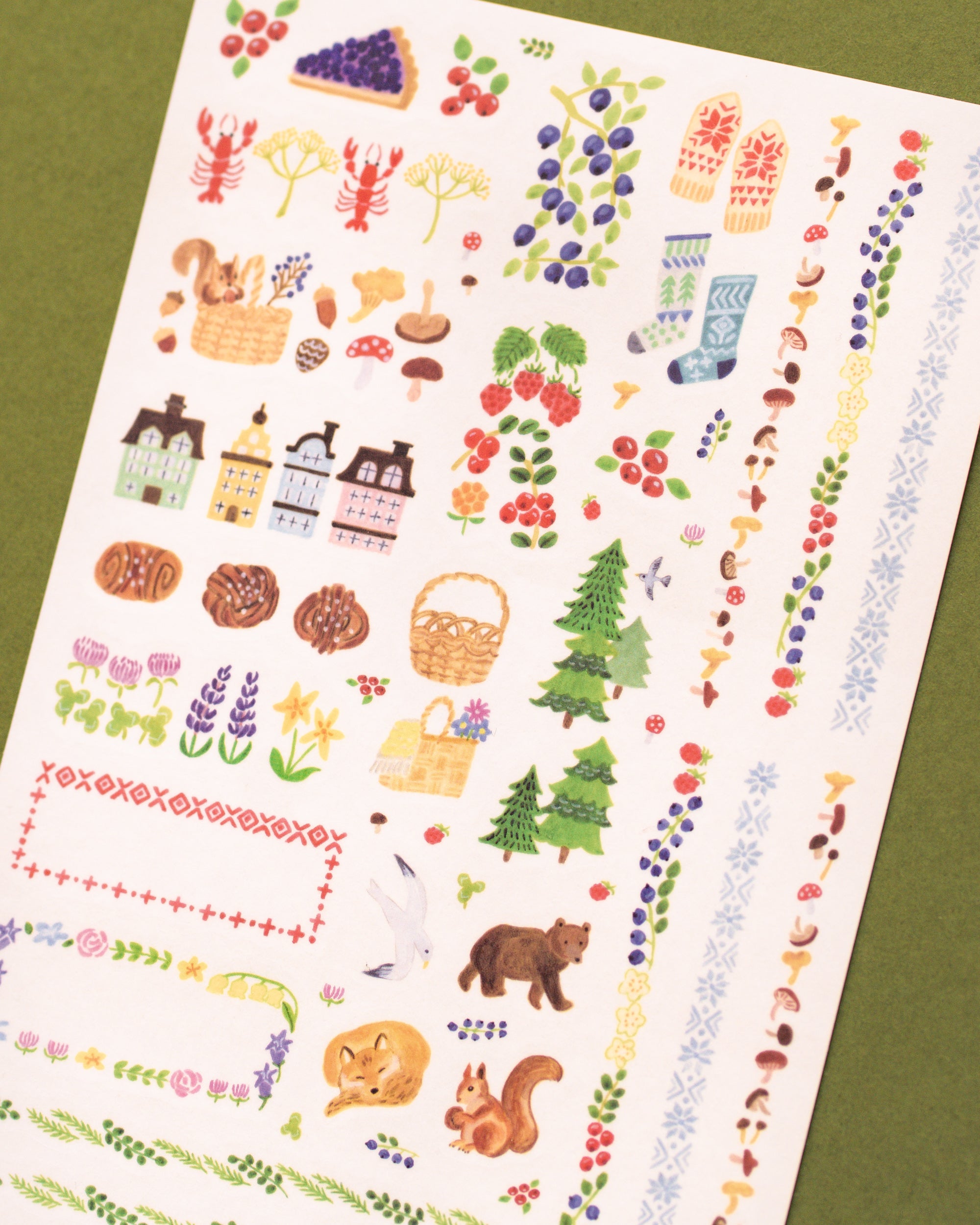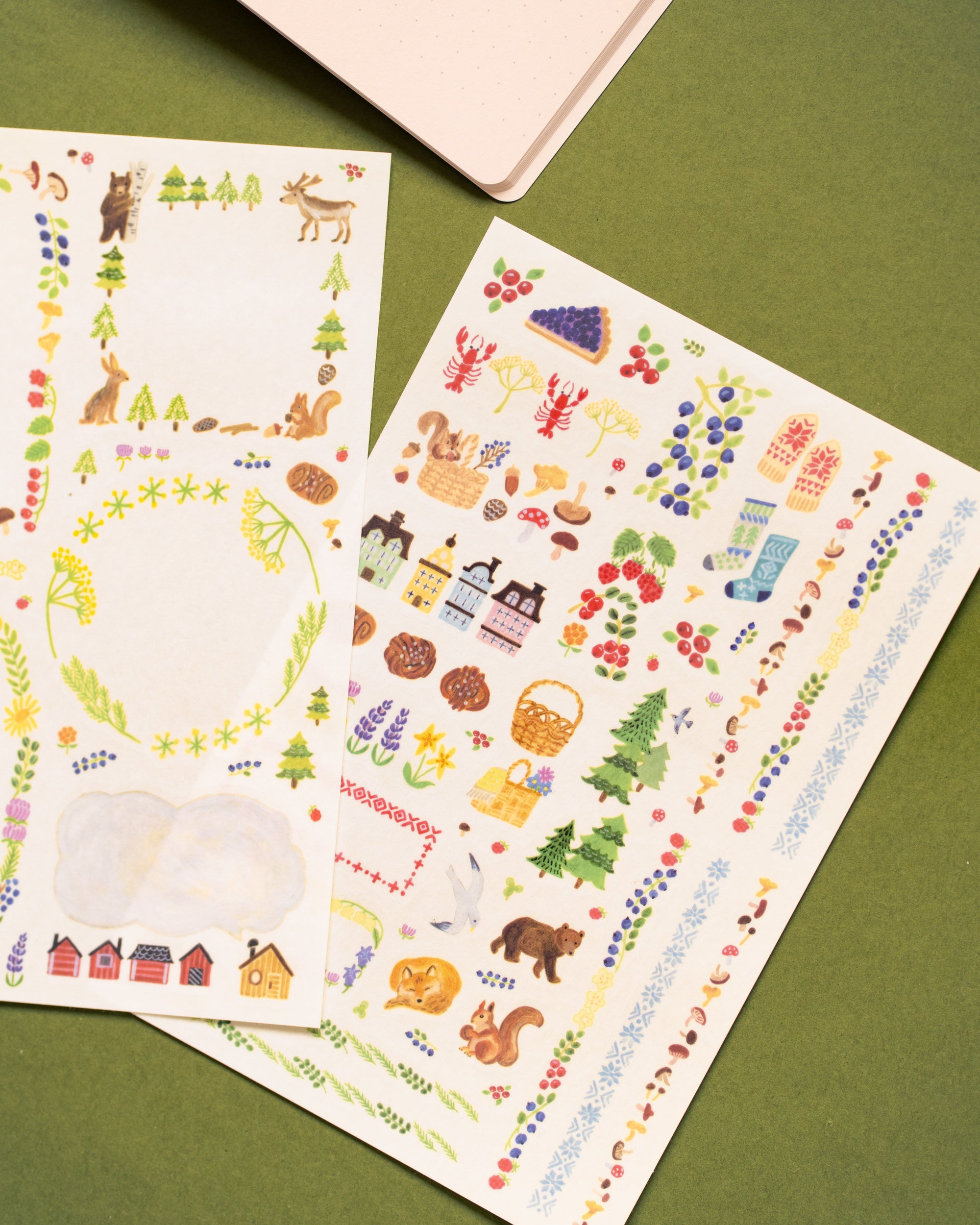 Ce set comprend deux feuilles de stickers sur le thème de la Scandinavie illustrés par Masako Shintani. Inspirés des paysages enchanteurs de la Finlande ces autocollants apportent une touche nordique à vos carnets. Personnalisez facilement vos pages en écrivant directement sur les autocollants ou en les disposant dans les marges pour un style unique et créatif.